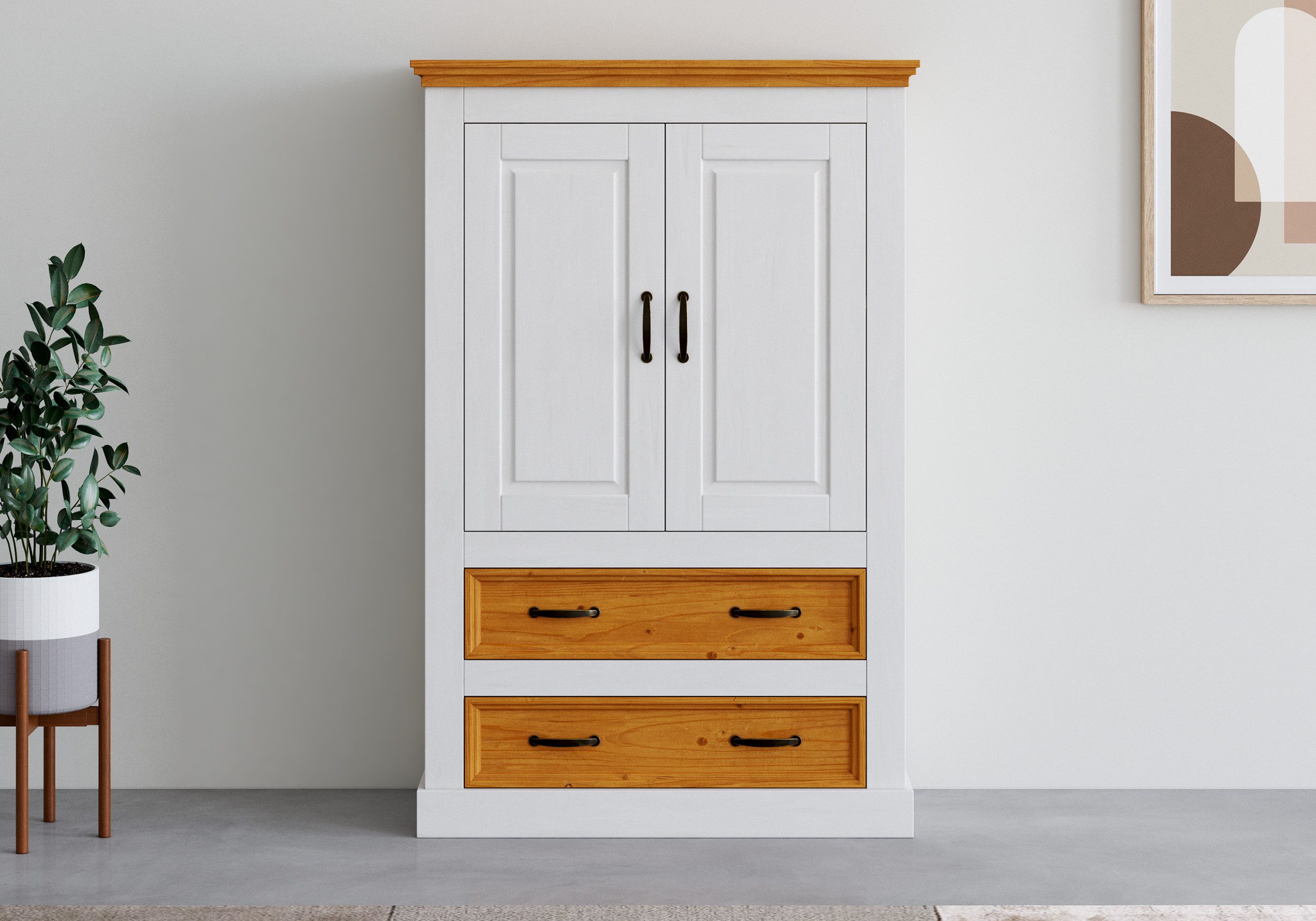 Das Massivholz, aus dem der Schrank besteht, punktet durch individuelle Optik, die ein natürliches Wohnambiente schafft. Das Wachs auf der Oberfläche macht das Holz unempfindlicher gegen Schmutz und Feuchtigkeit. Die Griffe aus Metall sind langlebig und unterstreichen den Stil. Getragen wird der Schrank von Sockeln aus Massivholz. So wird das Gewicht gleichmäßig verteilt und der Boden darunter entlastet.