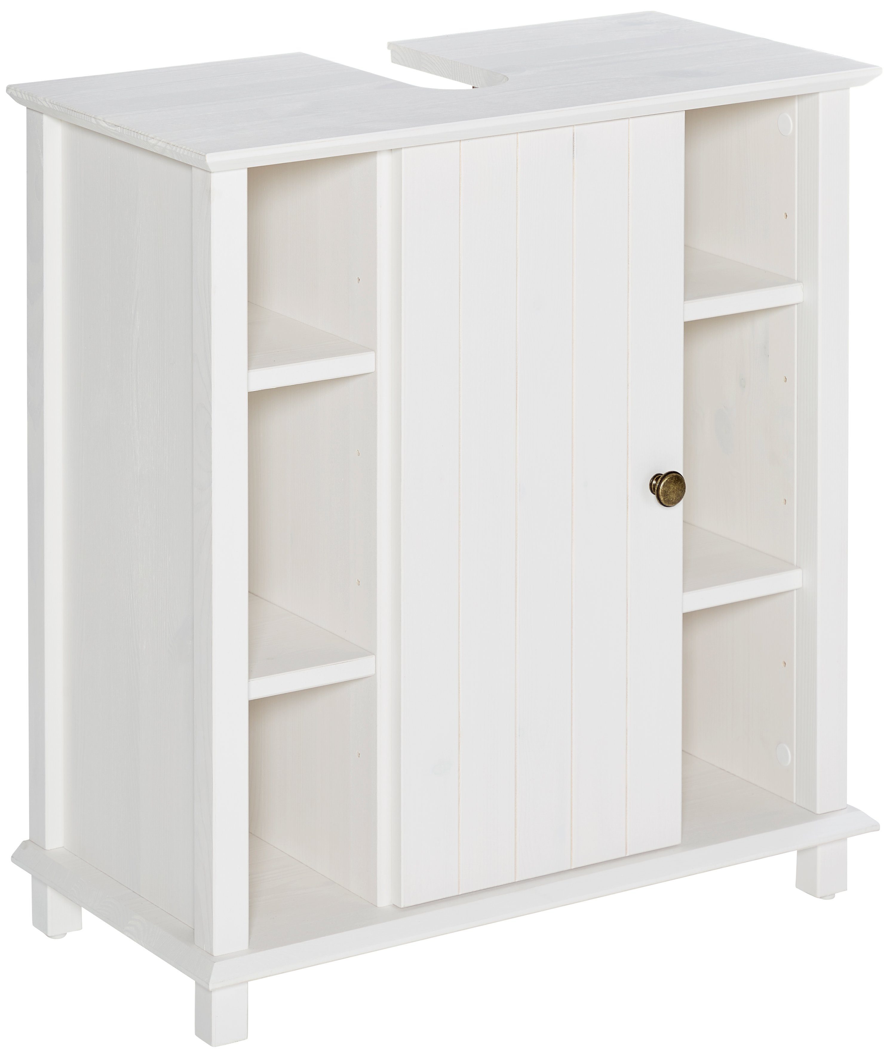 Wissenswertes | Aus FSC®-zertifizierter, massiver Kiefer. Geölt oder weiß gewachst. Scharniere und Griffe aus Metall. Mit 1 Tür und 6 offenen Fächern (Fachmaße je 12,5/ 27/18 cm). Maße der Tür (B/H):25,2/55,9 cm Fachmaße hinter der Tür (B/T/H): 24/25,8/56,4 Siphonausschnitt (B/T): 8/20 cm Fußhöhe ca. 5 cm Gesamtmaße (B/T/H): 60/30/65 cm. Всеs ca.-Maße. Mit Aufbauanleitung. Ohne Dekoration. |