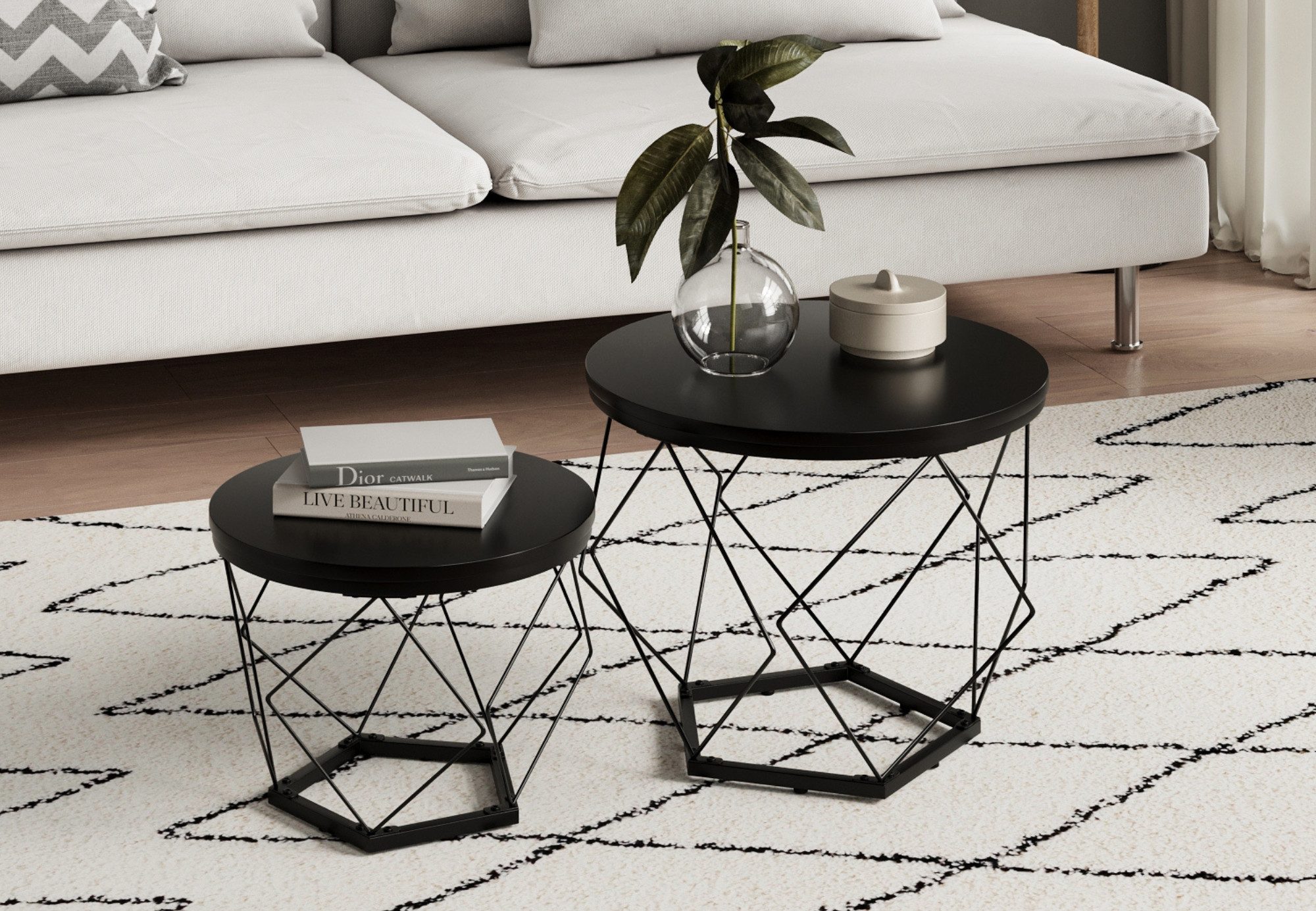 Dieses moderne Couchtisch-Set vereint Form und Funktion in einem stilvollen Design. Mit zwei unterschiedlich großen Tischen bietet es vielseitige Einsatzmöglichkeiten – ob gemeinsam arrangiert oder einzeln genutzt. Die runden Tischplatten in Holzoptik oder Schwarz bringen einen klaren Akzent ins Wohnzimmer und lassen sich mühelos in verschiedene Wohnstile integrieren.