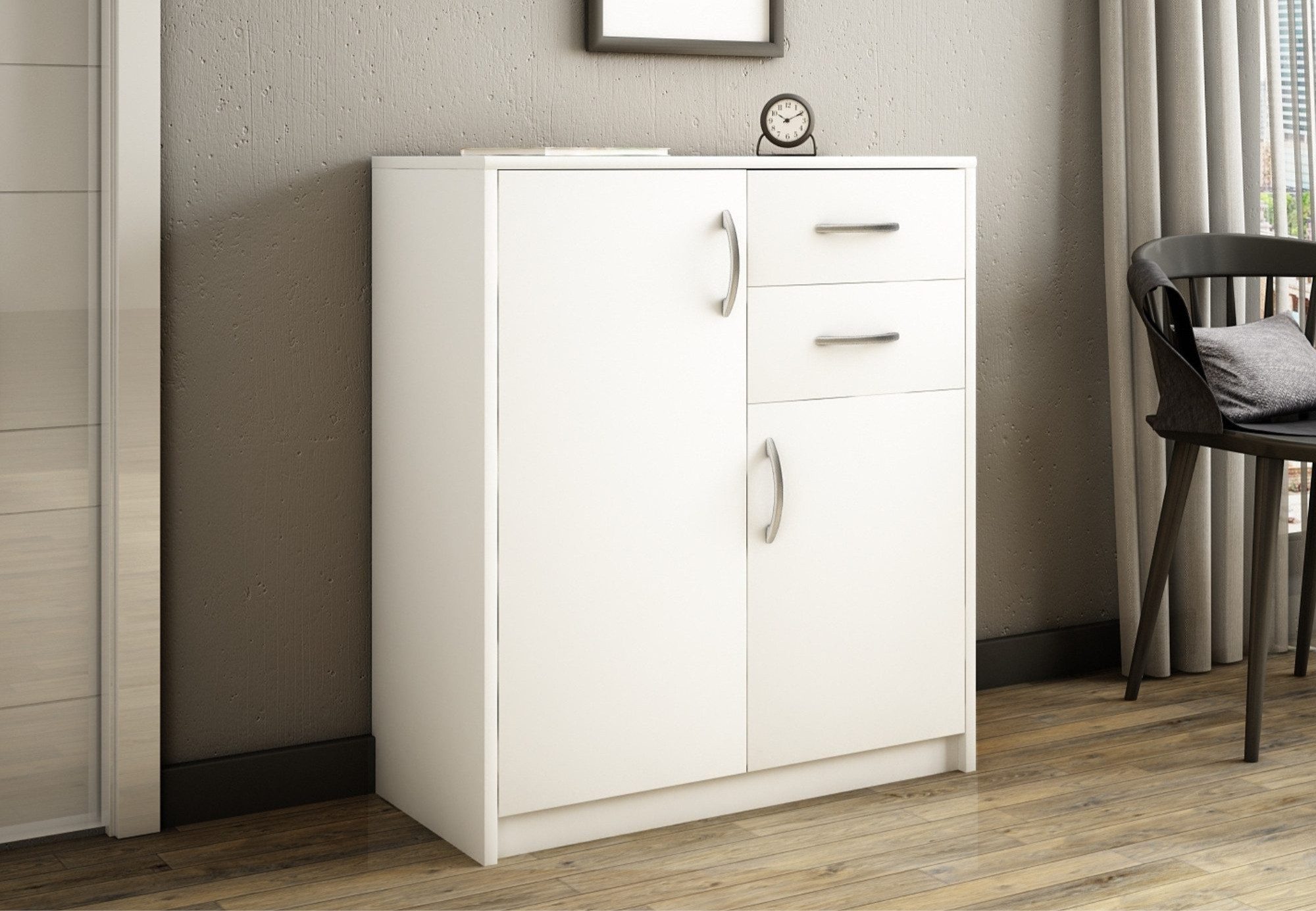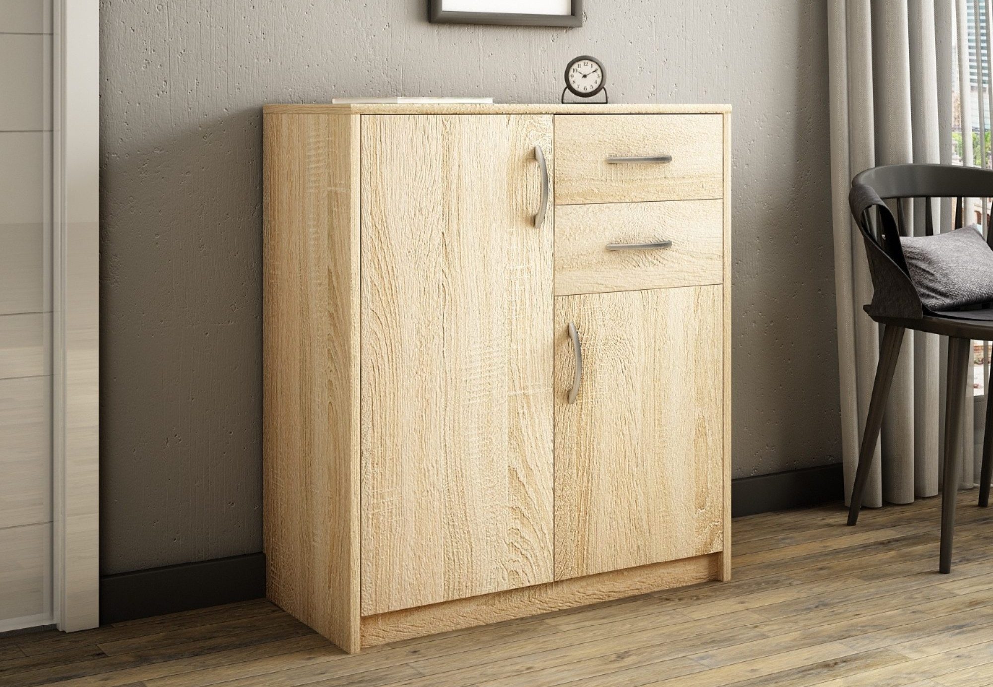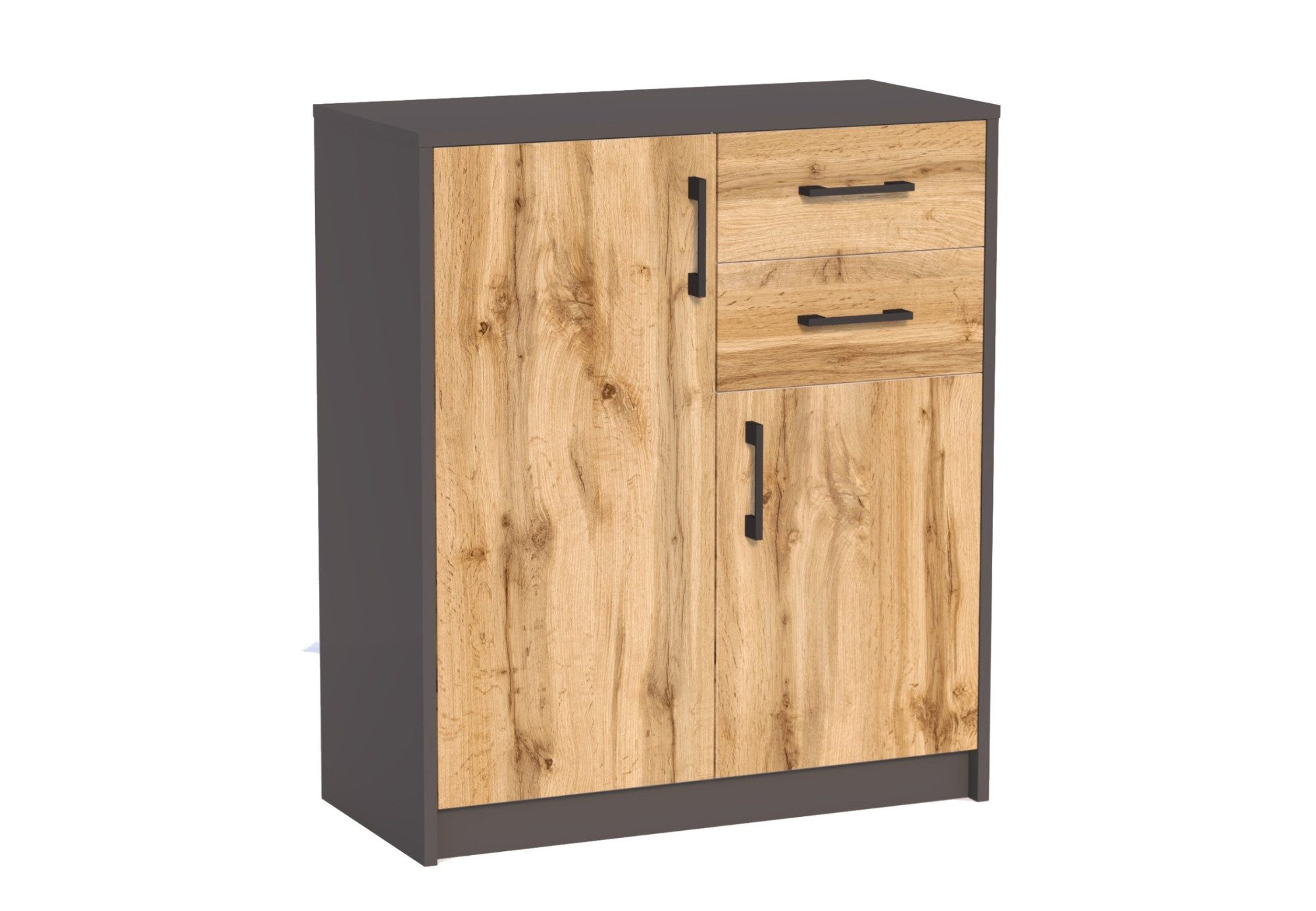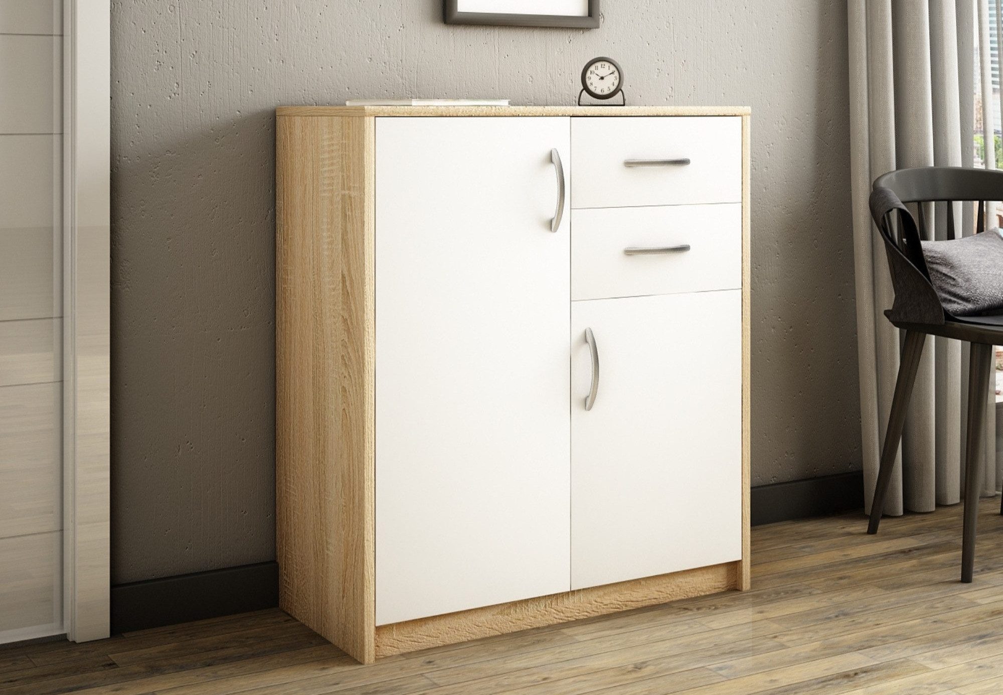 Diese Kommode ist eine perfekte Kombination aus Funktionalität und Stil und wurde so gestaltet, dass sie sich nahtlos in jeden Raum einfügt. Hergestellt aus strapazierfähiger 16 mm dicker laminierter Platte mit einem 0,5 mm dicken Rand, gewährleistet sie Langlebigkeit und Widerstandsfähigkeit. Die Kommode verfügt über zwei geräumige Schubladen und zwei Türen, die ausreichend Stauraum für Ihre Essentials bieten. Die sanft abgerundeten Kanten der Tischplatte erhöhen die Sicherheit, was sie zur idealen Wahl für Familien mit Kindern macht. Die Schubladen lassen sich reibungslos auf Metallrollenführungen mit Auszugsperre bedienen, was einen einfachen Zugang und Sicherheit gewährleistet. Die matte Oberfläche, kombiniert mit hochwertigen Polymergriffen, verleiht dem Design einen Hauch von moderner Eleganz.