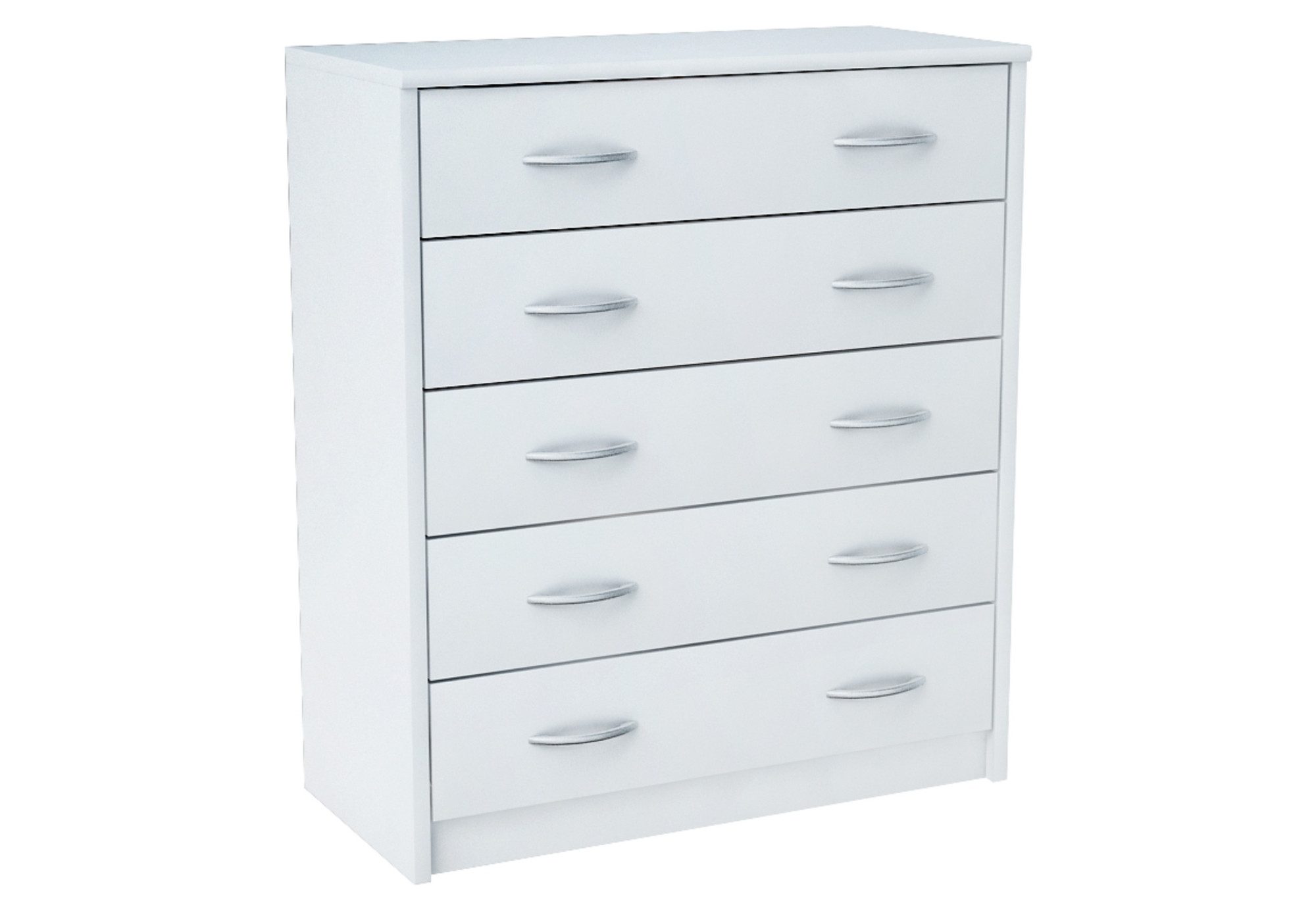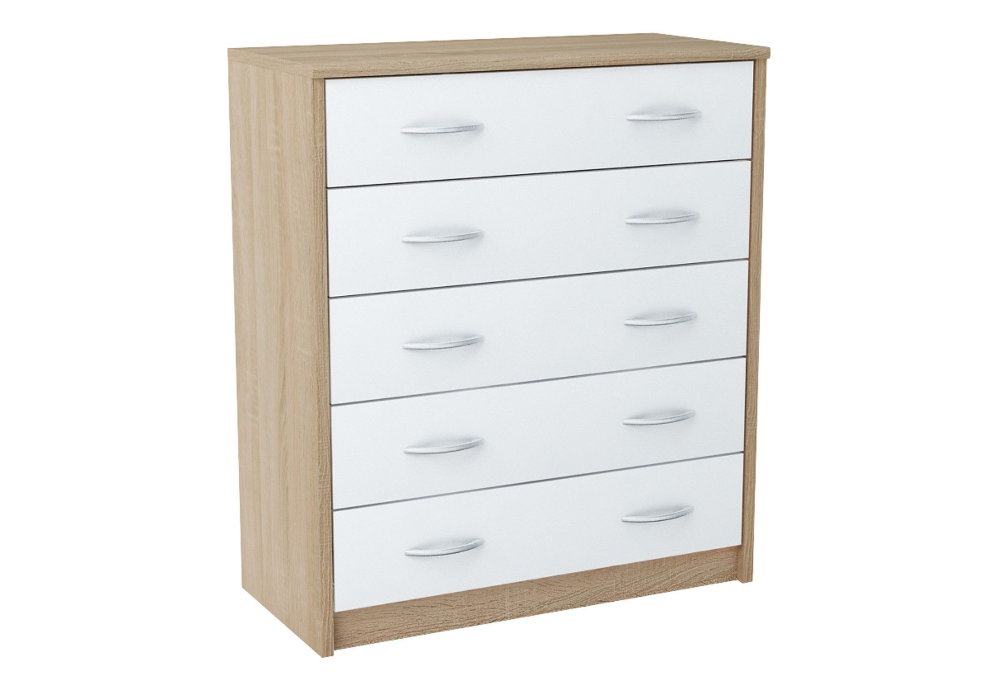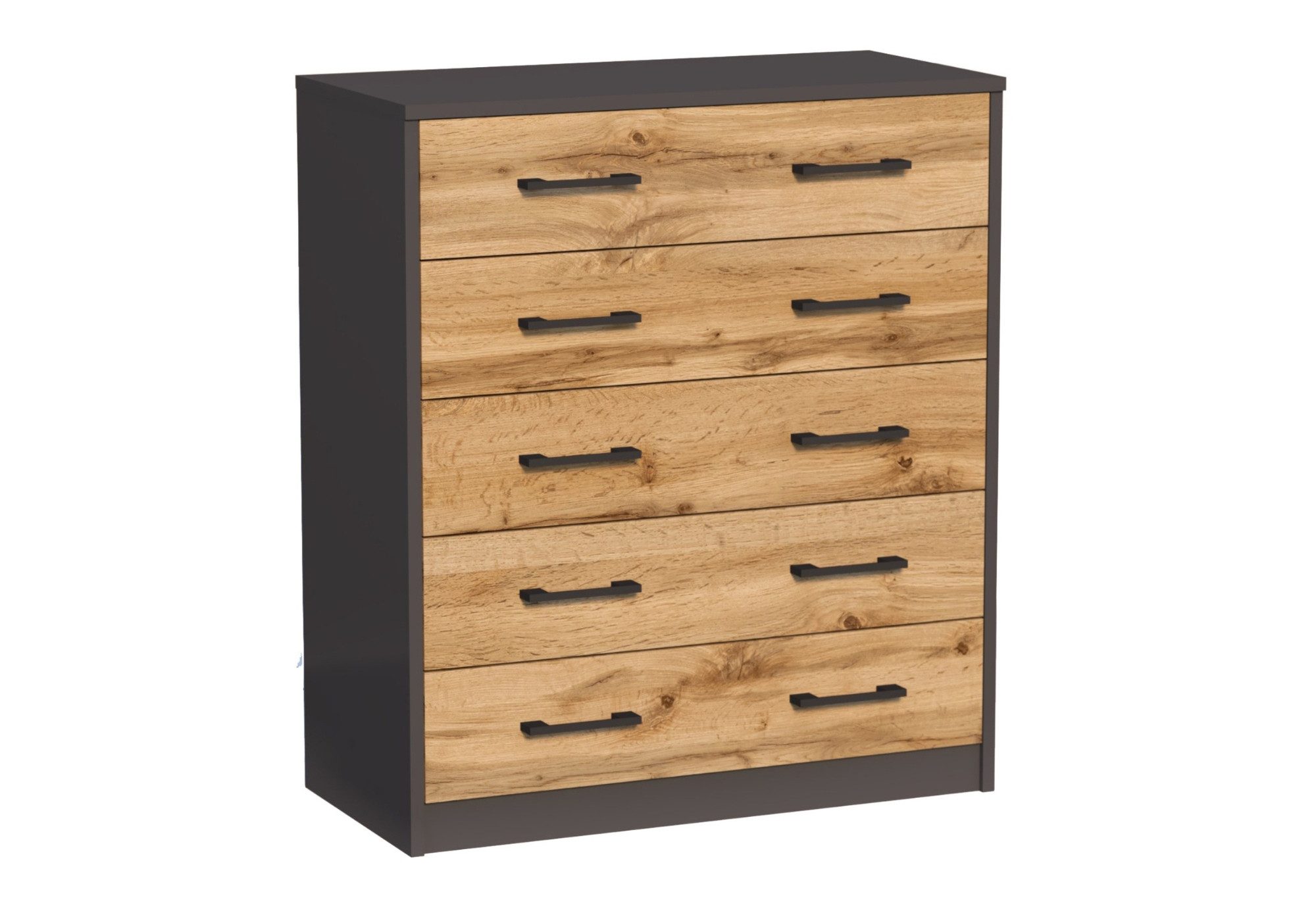 Diese Kommode bietet eine perfekte Kombination aus Stil und Funktionalität und ist eine wertvolle Ergänzung für jeden Raum. Mit fünf geräumigen Schubladen bietet sie reichlich Stauraum für Kleidung, Bettwäsche oder andere Haushaltsgegenstände und sorgt dafür, dass Ihr Raum ordentlich und aufgeräumt bleibt. Die Konstruktion aus strapazierfähigen 16 mm laminierten Platten ist auf den täglichen Gebrauch ausgelegt, während die matte Oberfläche ihrer Optik einen Hauch von Eleganz verleiht.