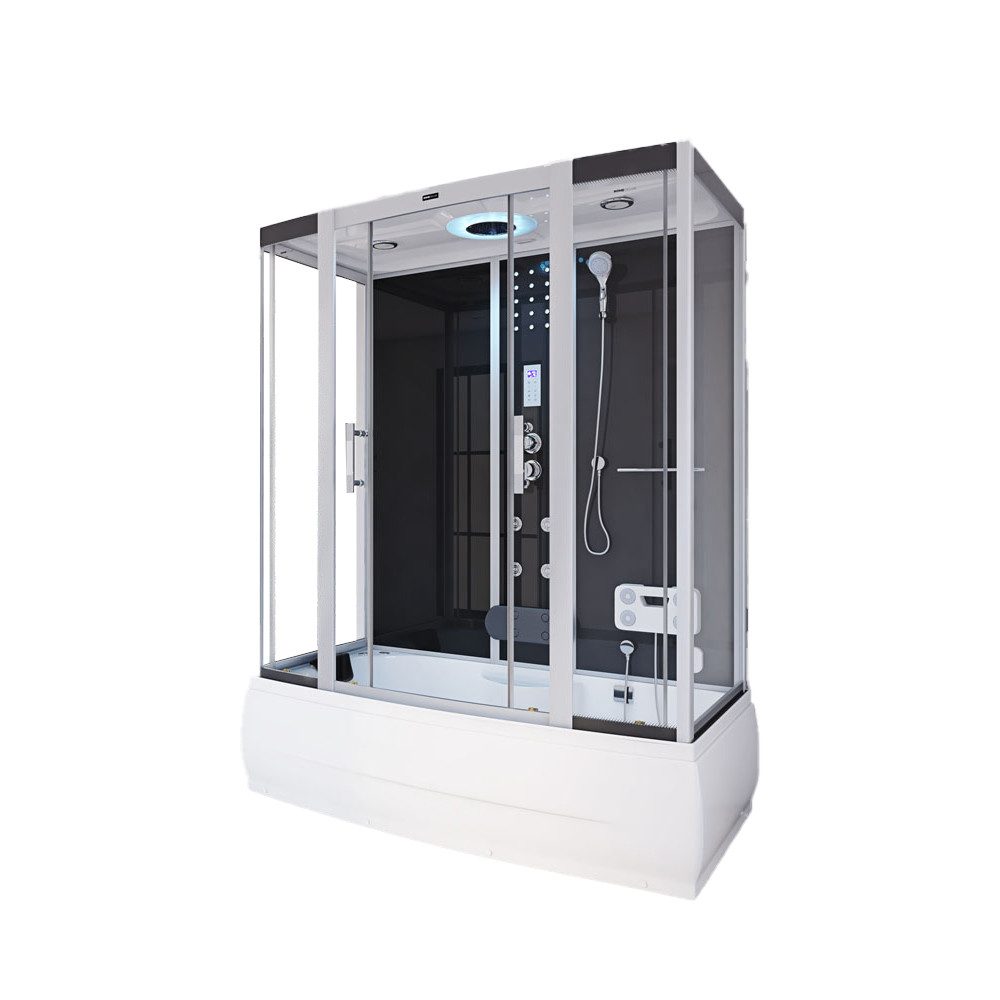 Dieses komplette Wellness-Erlebnis lässt Ihr Herz höherschlagen. Die Diamond BIG wurde eigens ergonomisch konzipiert, damit es überhaupt möglich ist, auf solch kleinstem Raum solch eine Ausstattung zu gewährleisten. Egal ob Duschen, Baden (Whirlpool) oder Saunieren, die Diamond BIG macht alles, egal in welcher Kombination, auf Knopfdruck möglich. Selbstverständlich ist auch der gewöhnliche Gebrauch über eine Handbrause, die über die befestigte Duschstange justierbar ist, möglich. Das moderne Design, gepaart mit guter Funktionalität, runden unseren Хиты продаж ab. Entspannen Sie sich bei einem beruhigenden Whirlpoolgang unter dem blauen Deckenhimmel, lassen Sie die Seele bei einem warmen Tropenregen baumeln, oder verlieren Sie Ihren Stress bei einem Dampfbad, optional auch mit Duftaroma. Das integrierte Ozon-Desinfektionssystem sorgt für rückstandslose, umweltfreundliche Reinigung. Der in der Wanne eingefasste Sitz und die Antirutschstruktur im Wannenboden gewährleisten den sicheren Gebrauch. Die integrierte Fußmassage für eine entspannte Reflexzonentherapie und die 8 Rückenmassagedüsen, die an der Mittelkonsole Ihren Rücken massieren, machen das Entspannungserlebnis perfekt. Nicht nur die Eigenschaften sind herausragend, auch die Qualität ist für den angegebenen Preis mehr als fair. Hier zu erwähnen sind vor allem die 5 mm starke, schwarzgetönte ESG-Vollverglasung der ""Diamond-Serie"", sowie auch die Aluminium-Rahmenkonstruktion und das computergesteuerte Touch-Bedienelement. Die auf fast jeden Untergrund anzupassenden höhenverstellbaren Füße der Duschwanne machen dieses Produkt nahezu an jedem Ort montierbar.