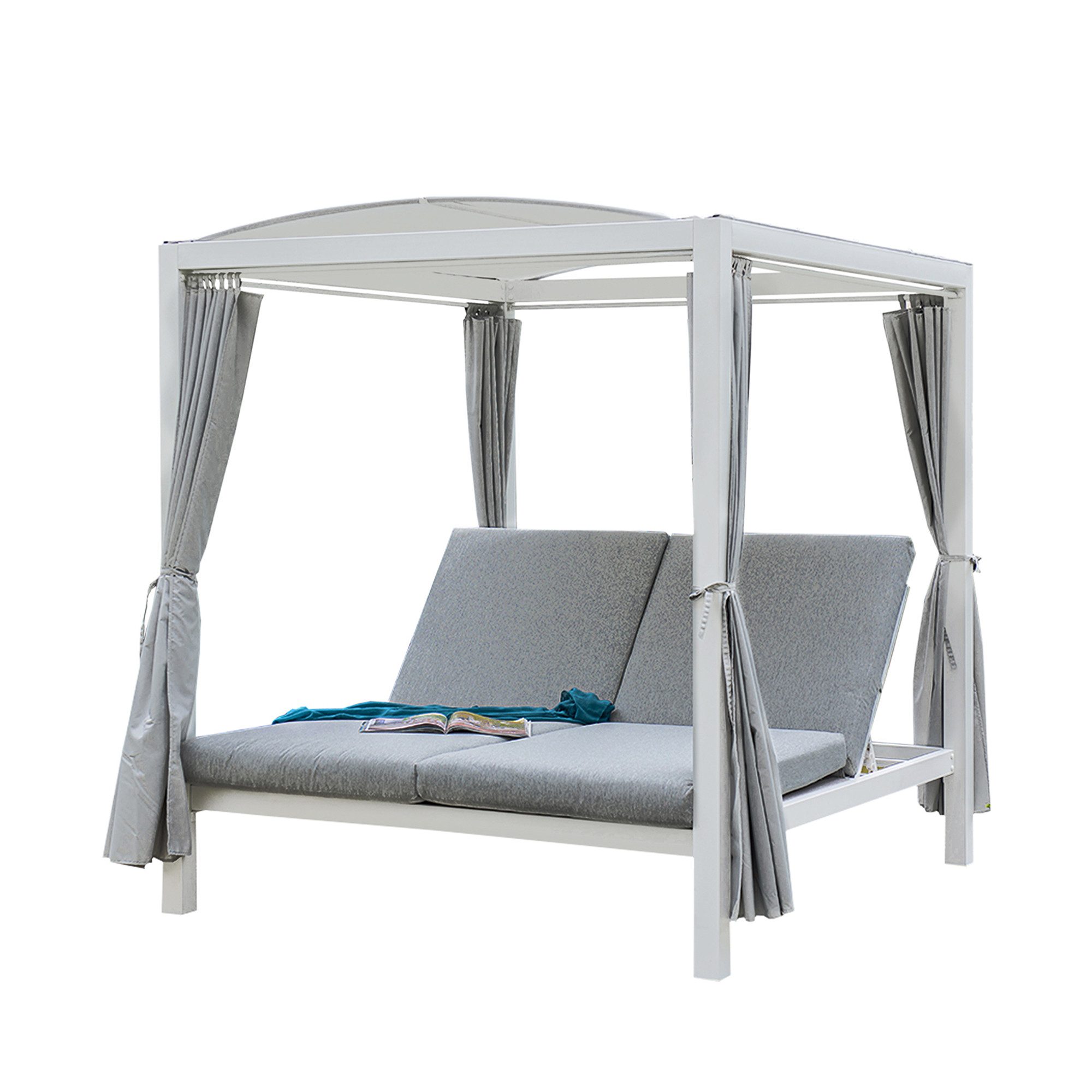 Gibt es im Sommer etwas Schöneres? Sei es auf der Terrasse oder im Garten - unsere wunderschöne Pavillon Gartenliege LYON mit 4 Seitenvorhängen lädt zum Erholen und Träumen ein. Auf der exklusiven Doppelliege lässt sich die Zeit vergessen. Neben dem einzigartigen Komfort und dem modernen Design ist die Stabilität des Pavillons auch ein Faktor. Das Modell weist einen robusten Rahmen aus pulverbeschichtetem Stahl auf.