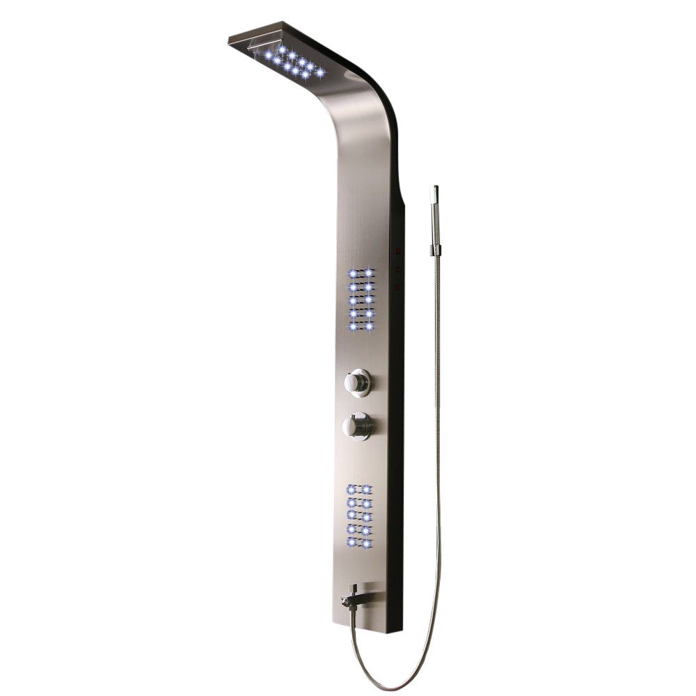Dieses moderne Duschpaneel ist der Hingucker in jedem Badezimmer und eine einfache Komplettlösung für jedermann. Das Duschpaneel arbeitet mit einer 5-fachen Wasserverteilung. Über die integrierte Mischarmatur kann man nach Belieben die Wasserfallfunktion, die große Tropenbrause, die Massagedüsen, die Handbrause oder den Wanneneinlauf ansteuern. Die Handbrause besteht aus massivem Messing mit hochfest verchromter Oberfläche. Die Düsen sind mit speziellen Anti-Kalknoppen ausgestattet, wodurch die Reinigung dieses Produktes praktisch wie von alleine von der Hand geht. Die Wassertemperatur ist bis max. 50 Grad stufenlos einstellbar. Durch die große Skalierung ist die Temperatur praktisch gradgenau einstellbar. Das Duschpaneel ORINOCO ist aus gebürstetem Edelstahl gefertigt. Dank der 1/2"-Anschlüsse nach DIN-Norm ist eine einfache und schnelle Montage garantiert.