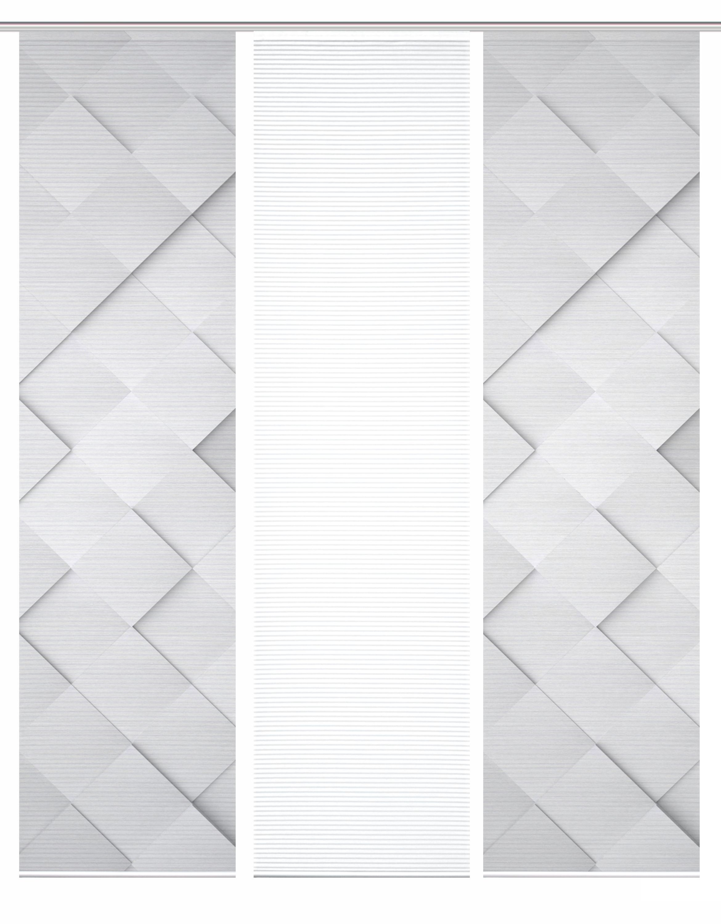 Dieses Design ist sowohl als einzelner Vorhang als auch als Set erhältlich, von einem 2er- bis zu einem 6er-Set. Im Set wird der Motiv-Flächenvorhang durch das passende weiße Uni-Modell ROMOLUS (Artikelnummer 84030) ergänzt. So entsteht eine ideale Kombination aus Motiv und einfarbigem Vorhang, die es Ihnen ermöglicht, die Bahnen auf mehrspurigen Gardinenschienen beliebig neu anzuordnen.