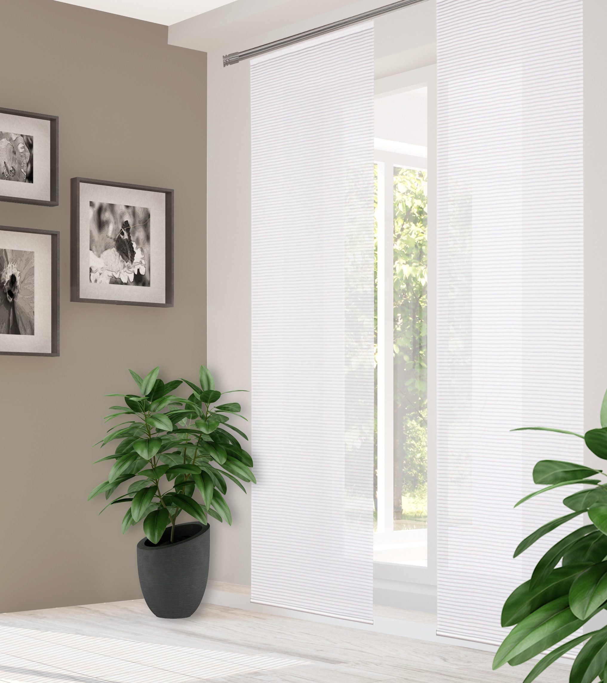 Hinweis Dekoration | Die angegebenen Maße sind die fertig dekorierten Maße. Eine Schiebegardine ist eine schmale, glatt hängende Stoffbahn, die sich sowohl als Sichtschutz als auch zur Raumteilung eignet. Durch die Schiebetechnik sind Schiebegardinen sehr flexibel einsetzbar. |