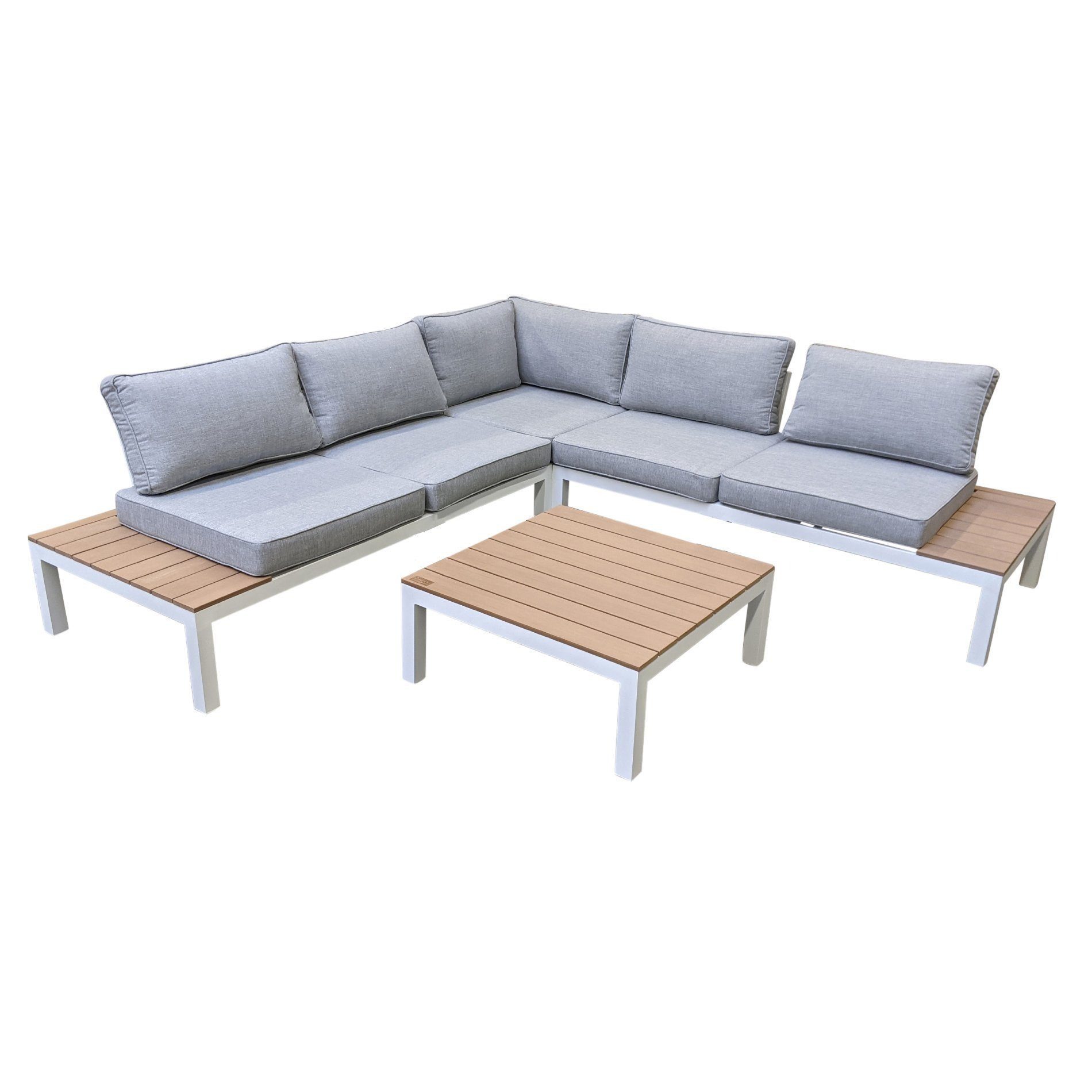 Erleben Sie maximalen Komfort mit dem 4-teiligen Loungeset "Laos" von Home Islands. Diese Serie kombiniert pulverbeschichtetes Aluminium geschickt mit komfortablen Kissen. Die Lounge-Seitenteile, zusammen mit einem Eckteil, bieten praktische Ablagen aus Polywood. Ein passender Loungetisch rundet das Set ab, wählbar in Weiß oder Anthrazit (Charcoal).