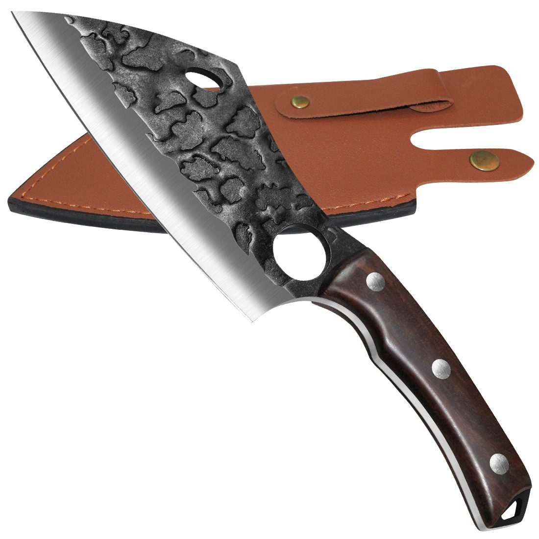Die Härte dieses Fleischmessers beträgt bis zu 62 + HRC und die Klinge wird von Hand auf 20 Kantengrad geschliffen, was ein einfaches Honen, Flexibilität, lang anhaltende Schärfe und erhöhte Effizienz beim Schneiden und Hacken gewährleistet