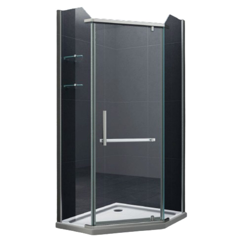 -Glasscheiben aus 8 mm Sicherheitsglas (ESG) -Easy-Clean Oberflächenbeschichtung -hochwertige Aluminiumprofile -Fünfeckdusche -vollständige Verdeckung der Verschraubung -bis zu 15 mm Wandausgleich -Scharniere & Türgriff aus Messing, verchromt -Tür nach außen öffnend -inkl. 2 Glasregalen -Magnetabdichtung für wasserdichten Verschluss -leichte Montage, auch ohne Fachkenntnisse -Bodenebene Montage ebenfalls möglich -Links- oder Rechtsmontage frei wählbar -Bei Auswahl mit Duschtasse: inkl. 50 mm flache Duschtasse aus Sanitäracryl (90 mm Ablaufloch)