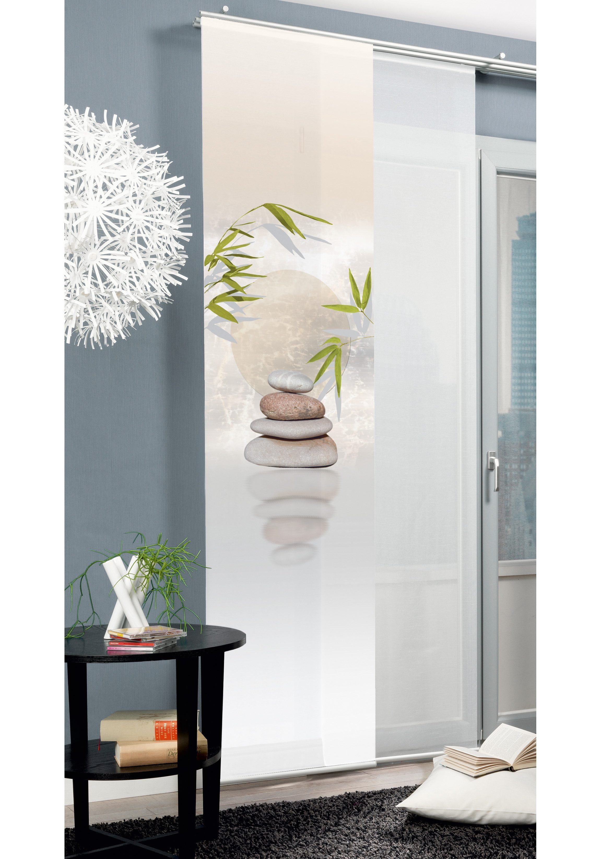 Hinweis Aufhängung | Der Paneelwagen wird mit beiliegenden Röllchen oder mit X-Gleitern an jeder gängigen Gardinenleiste oder -schiene montiert. |