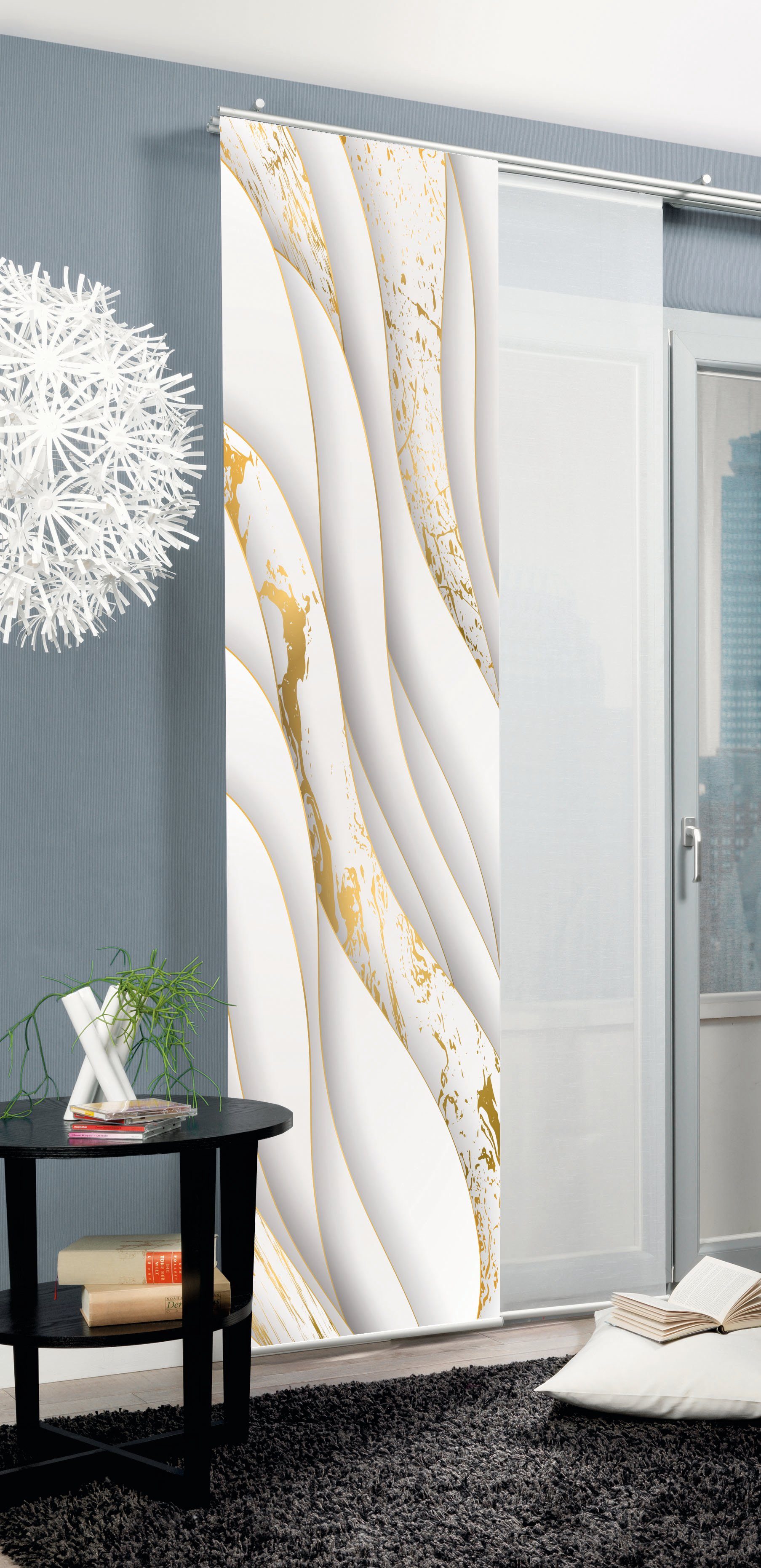 Hinweis Dekoration | Die angegebenen Maße sind die fertig dekorierten Maße. Eine Schiebegardine ist eine schmale, glatt hängende Stoffbahn, die sich sowohl als Sichtschutz als auch zur Raumteilung eignet. Durch die Schiebetechnik sind Schiebegardinen sehr flexibel einsetzbar. |