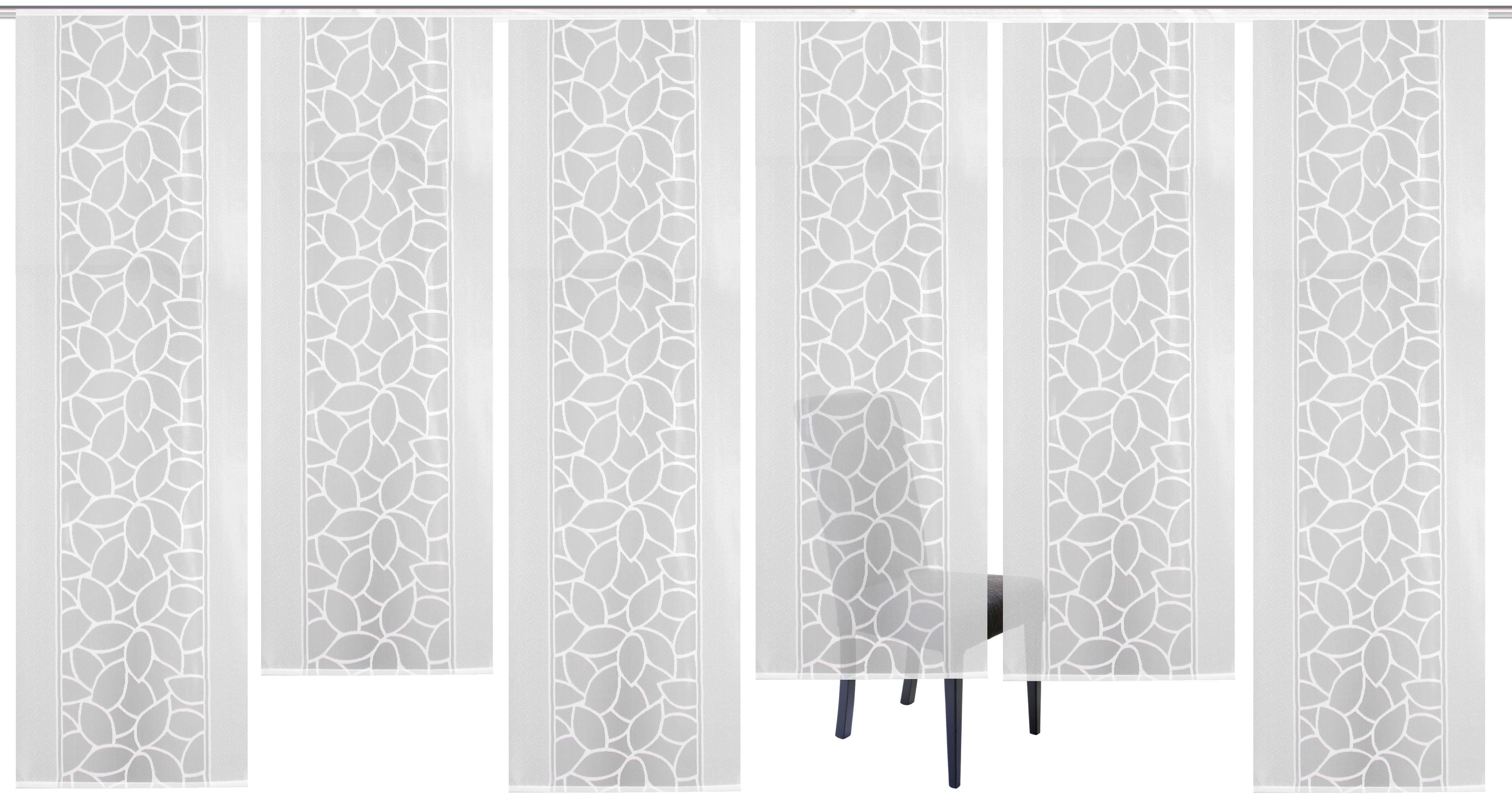 Der Schiebevorhang »JENNA« von HOME WOHNIDEEN ist eine besonders ansprechende Fensterdekoration. Das zarte Blätterdesign auf dem transparenten Jacquardgrund fügt sich optisch ausgezeichnet in verschiedene Wohnstile ein. Das Set besteht aus 6x Schiebevorhängen mit geradem Abschluss (3x Höhe 245cm und 3x Höhe 225cm). Aufhängung erfolgt mittels Flauschband und Klettschiene an Ihrer Gardinenschiene. »JENNA« lässt sich dank des mitgelieferten Zubehörs spielend einfach an gängigen Gardinenschienen anbringen, so zaubern Sie mühelos eine behagliche Wohlfühlatmosphäre in Ihren vier Wänden. Zur Beschwerung und Stabilisierung dient die beiliegende Beschwerungsstange. 100% Polyester