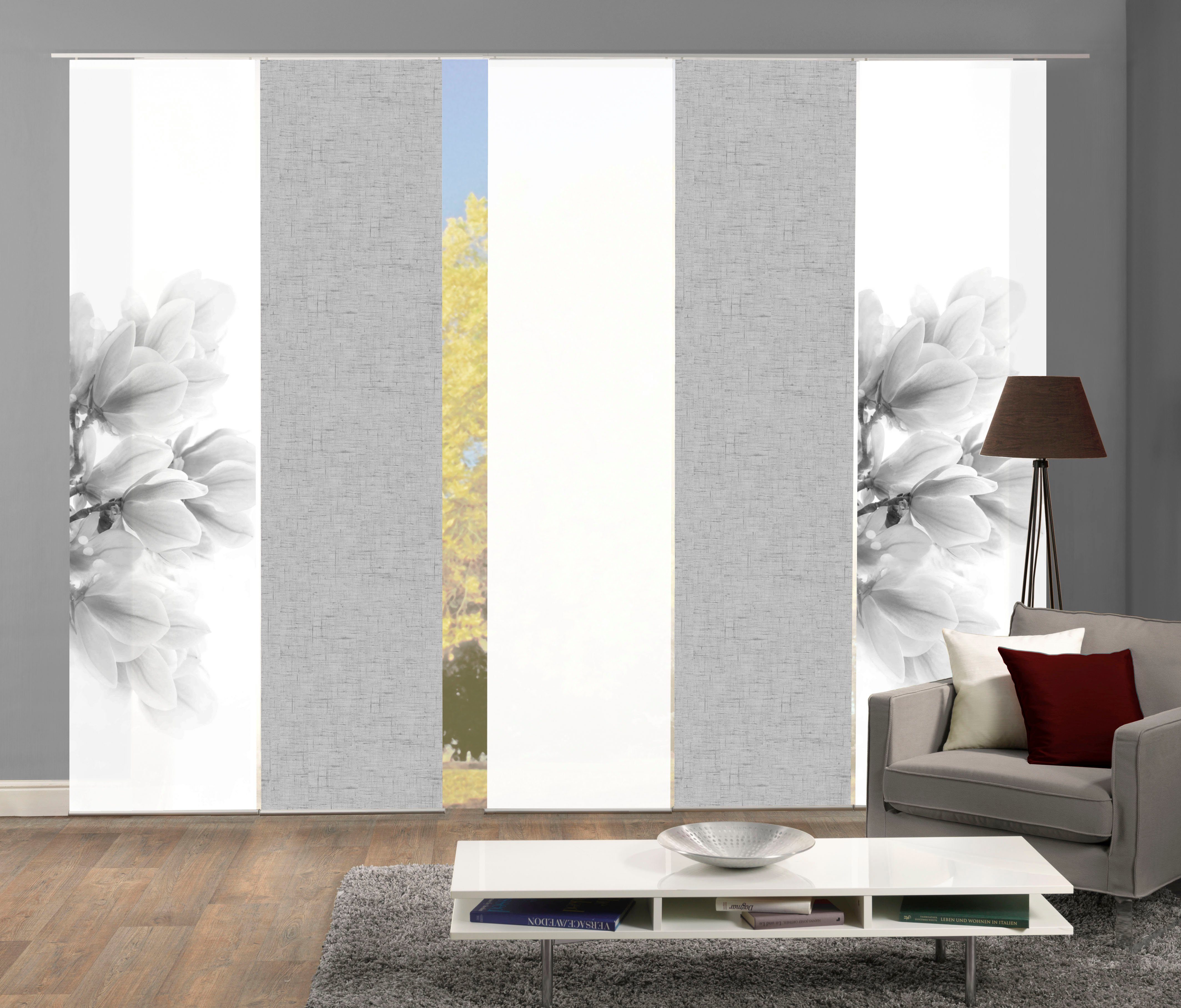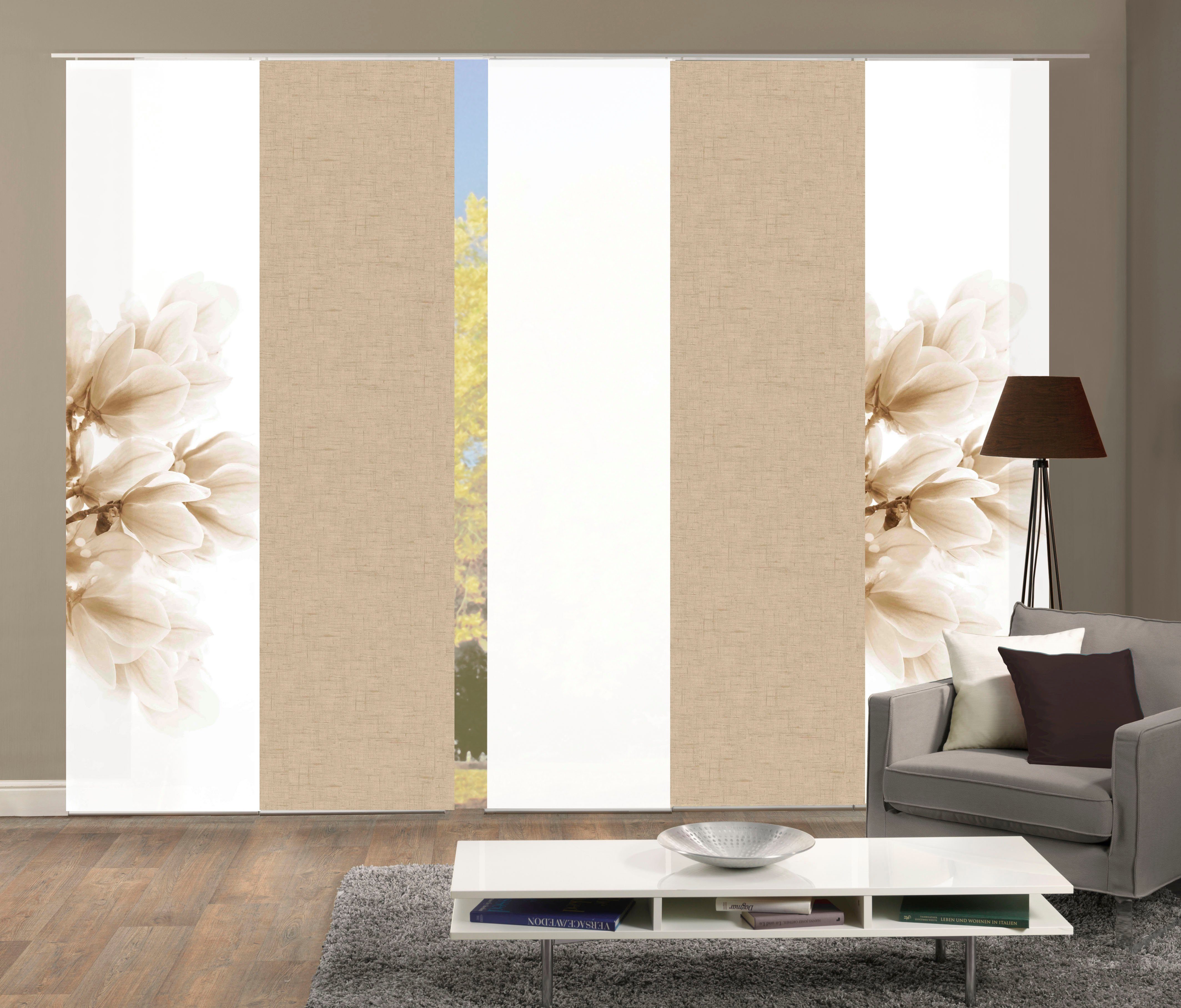 Hinweis Dekoration | Die angegebenen Maße sind die fertig dekorierten Maße. Eine Schiebegardine ist eine schmale, glatt hängende Stoffbahn, die sich sowohl als Sichtschutz als auch zur Raumteilung eignet. Durch die Schiebetechnik sind Schiebegardinen sehr flexibel einsetzbar. |