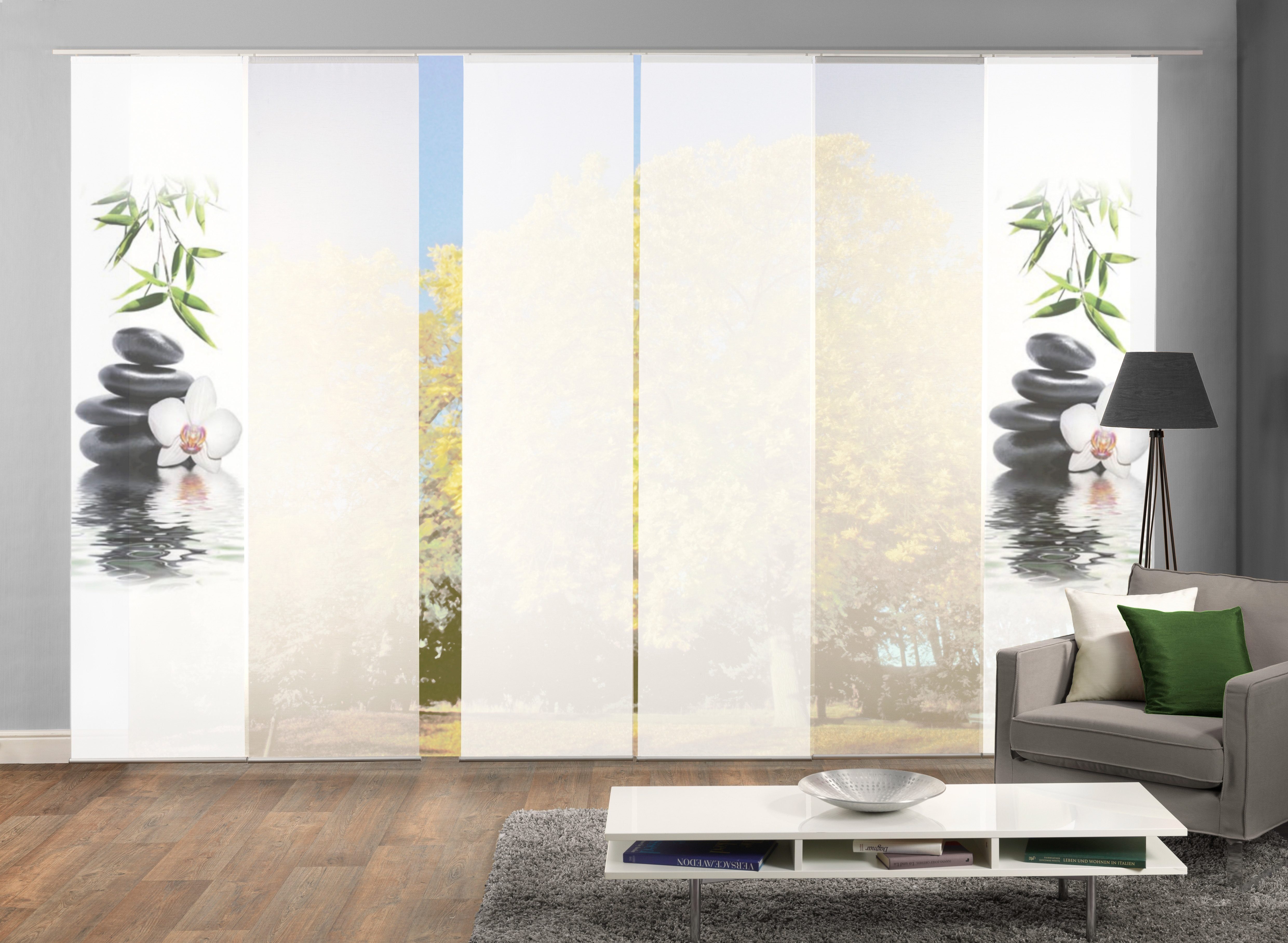 Hinweis Aufhängung | Der Paneelwagen wird mit beiliegenden Röllchen oder mit X-Gleitern an jeder gängigen Gardinenleiste oder -schiene montiert. |