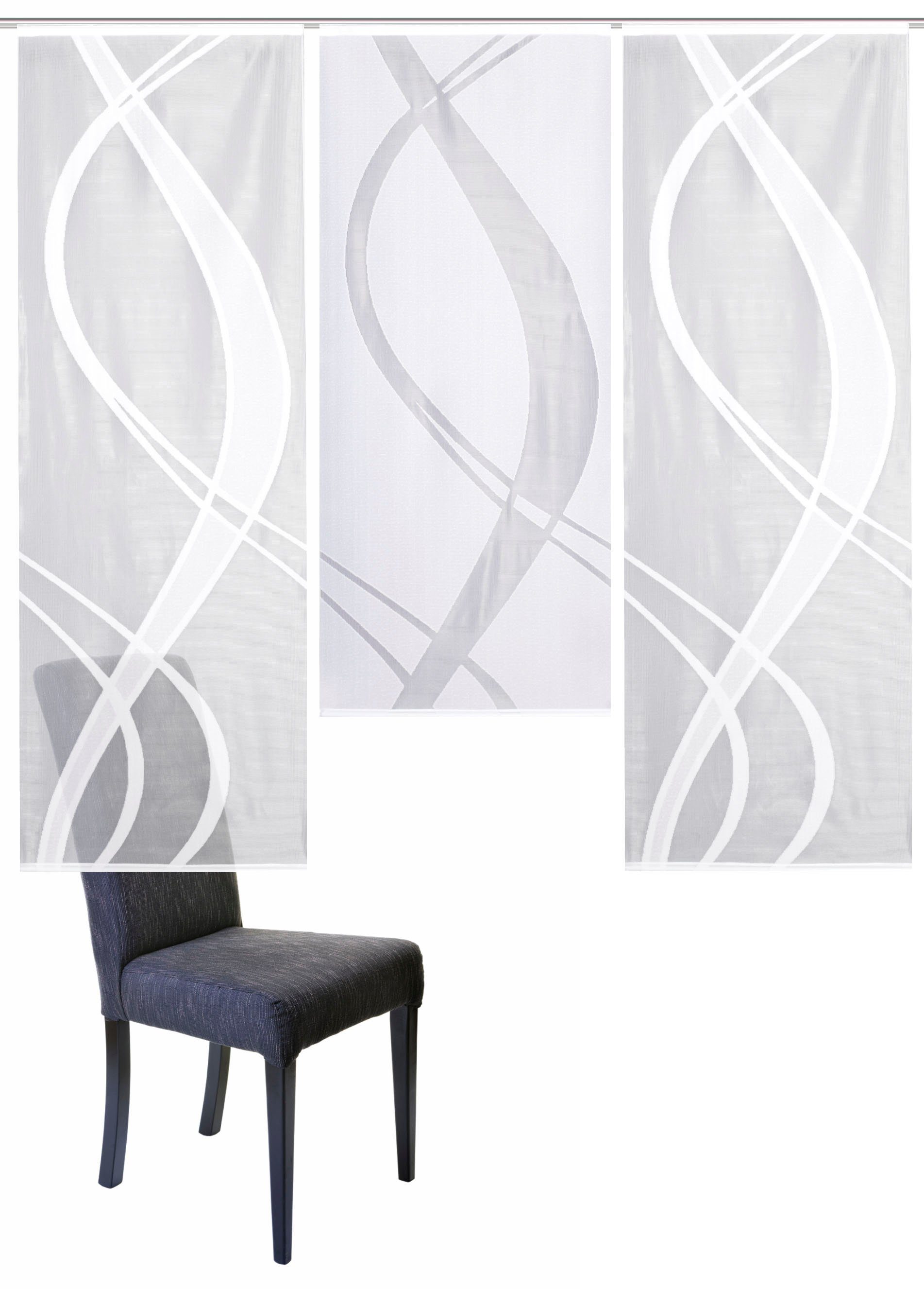 3er Set Schiebevorhang aus weißer Jacquard-Wirkware. Bestehend aus 2 Schiebevorhängen mit transparentem Grund mit dichtem Wellen-Motiv und 1 Schiebevorhang mit dichtem Grund und transparentem Wellen-Motiv. Made in Germany! Der Schiebevorhang TIBASO verbindet klassische Jacquard-Wirkware mit modernem Motiv und ist ein echter Eyecatcher an Ihrem Fenster. Oben mit Kunststoffträgerschiene mit eingehängten X-Gleitern und Gardinenröllchen (passend für alle gängigen Gardinenschienen), unten mit Beschwerungsstange, seitlich geschnitten vollendet der Schiebevorhang seine hochwertige Optik. verpackt in Polytüte, Pflegeleicht, da 100% Polyester. Die Größenangabe bezieht sich auf jeden einzelnen Schiebevorhang. Ideal für eine Fensterbreite von 145-175 cm. Made in Germany.