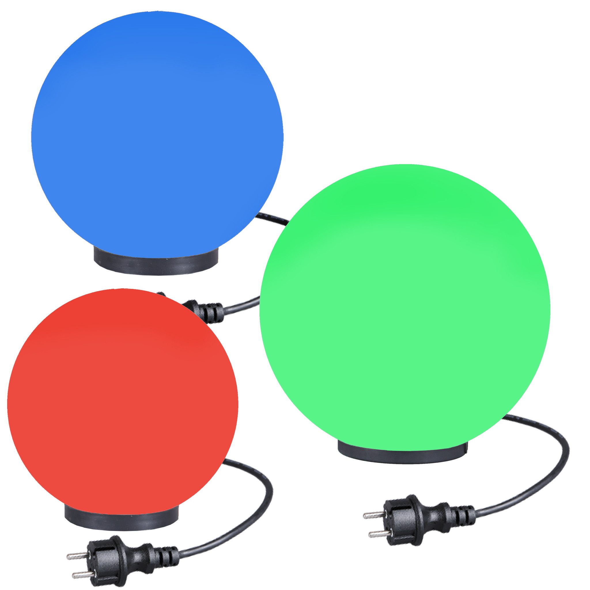1x20cm/ 1x 25cm/ 1x30cm Ø Kugelleuchte, 3x Bodenplatte inkl. Kabel, 3x RGB Leuchtmittel mit Fernbedienung, Gummifüße