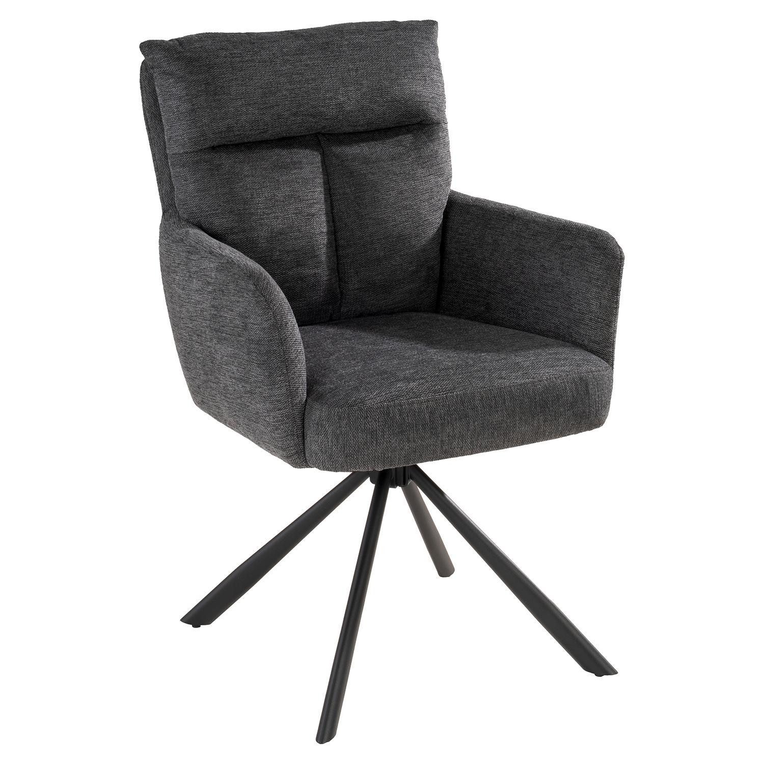 Der Polsterstuhl der Marke Home4You ist mit einem Webstoffbezug in Dunkelgrau ausgestattet. Das Gestell besteht aus Metall in Schwarz und verleiht dem Stuhl eine stabile Konstruktion. Der Sitz verfügt über eine Federkernpolsterung, die für einen angenehmen Sitzkomfort sorgt. Zusätzlich ist der Stuhl mit gepolsterten Armlehnen versehen, die weiteren Komfort bieten. Eine besondere Funktion stellt die 180-Grad-Drehbarkeit mit Rückholfunktion dar, die eine flexible Nutzung ermöglicht.