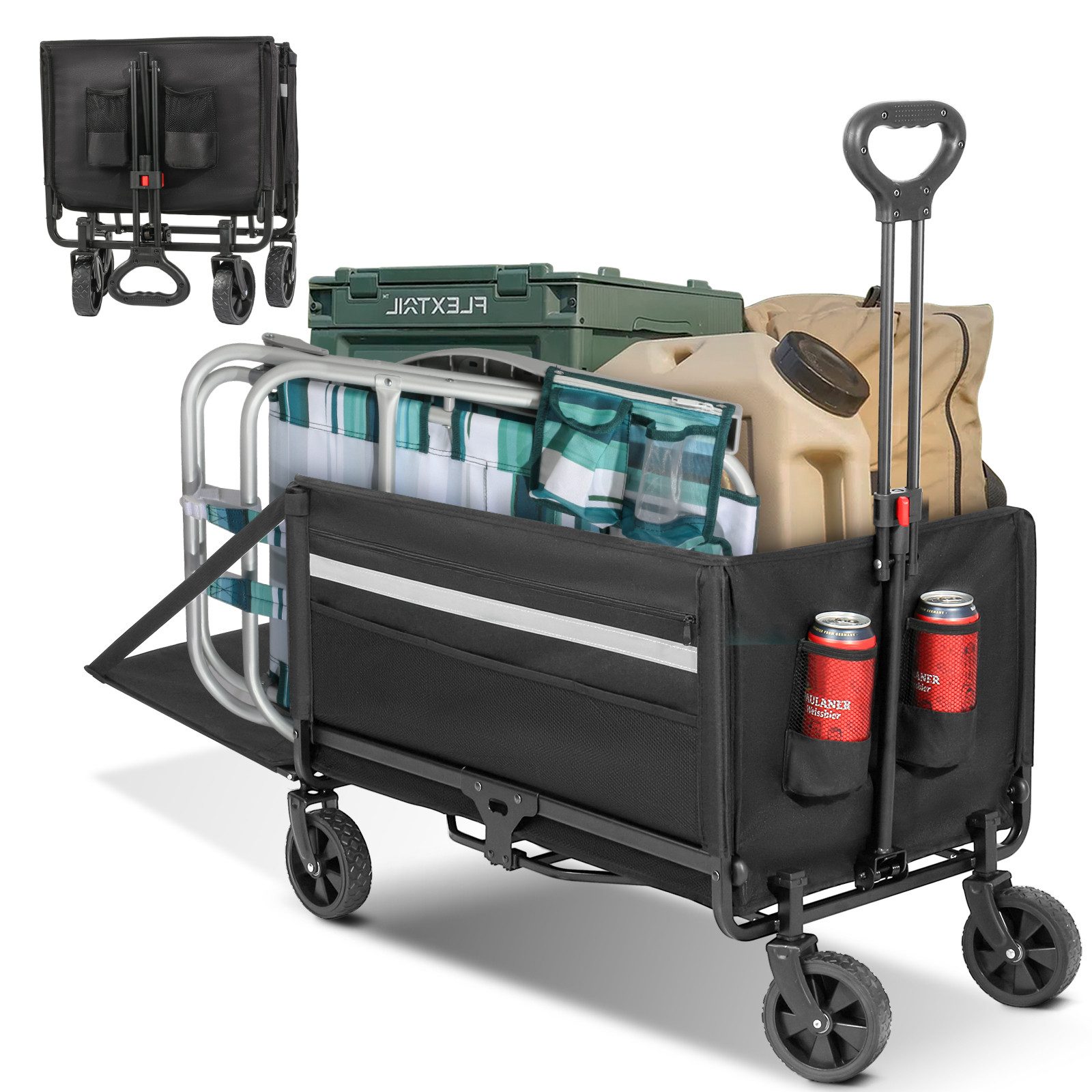 Praktisches Design + durchdachte Details! Flaschenöffner + Multifach! Der Bollerwagen mit integriertem Flaschenöffner ist ideal für Camping, Grillen und Partys – immer ein kühles Getränk griffbereit, ohne extra Werkzeug. Dank Becherhaltern, Seitentaschen und Netzfächern sind Wasserflaschen und Kleinigkeiten gut verstaut und schnell zur Hand. Perfekt organisiert, maximal praktisch!