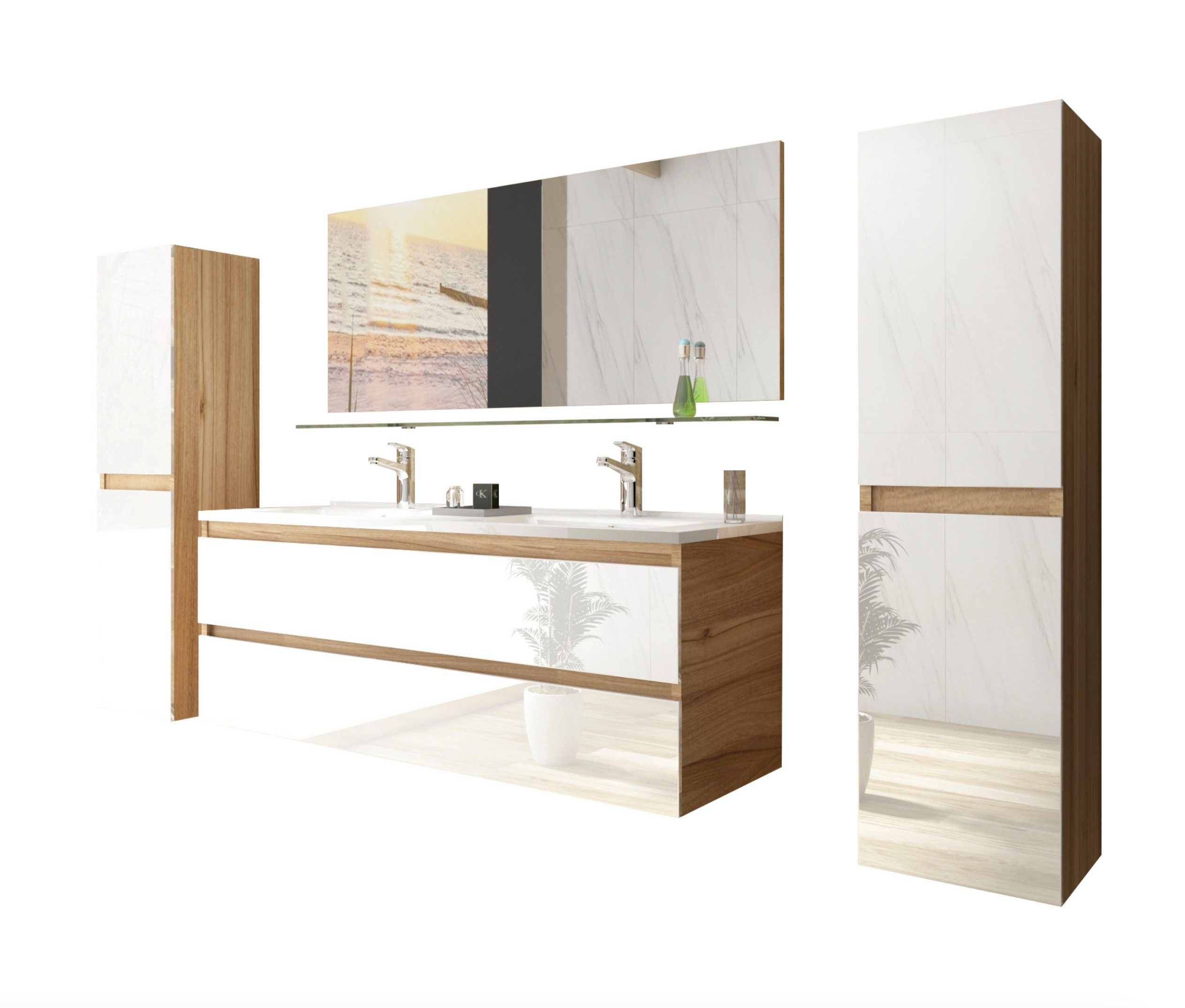 ***** Doppelwaschbecken Badmöbel Set 120 cm Leonard Weiss/Eiche Hochglanz Komplett bis 6 Teilig *****