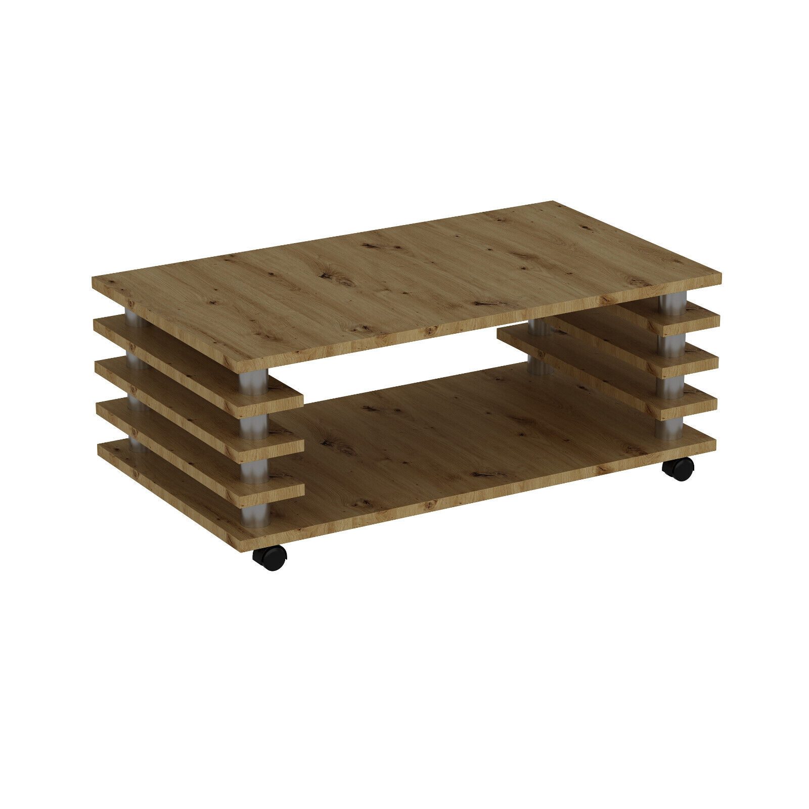 Hochwertiges Designer Couchtisch Eiche/Artizan, Nachbildung. Elegante Design. Der schlichte und elegante Tribus Couchtisch von Candy ist ein anmutiger und unvergesslicher Blickfang im Wohnbereich. Die in verschiedenen Formen und Größen gefertigten Designs aus Holz Abbildung und Travertin können zusammen – gestapelt oder nebeneinander angeordnet – oder unabhängig voneinander platziert werden, für eine einheitliche Wirkung. Diese Version kombiniert eine Tisch aus naturfarbenem Nachbildung. Erleben Sie puren Luxus.. Erleben Sie puren Luxus mit unserem modernen Couchtisch, der mit seinem eleganten Design und den funktionalen Rollen Ihr Zuhause bereichert. Die robuste Oberfläche ist nicht nur ein Blickfang, sondern auch äußerst langlebig, was ihn im täglichen Gebrauch besonders pflegeleicht macht. Im Gegensatz zu vielen anderen Sofatischen bewahrt dieser Tisch seine Schönheit über lange Zeit. Hinter unserem Produkt steht deutsche Handwerkskunst und Qualität. Der Couchtisch wird in Europa hergestellt, um höchsten Ansprüchen an Materialqualität und Verarbeitung gerecht zu werden. Wir legen Wert darauf, dass Sie nicht nur ein schönes, sondern auch langlebiges Möbelstück erhalten. Jede Platte des Couchtisches ist äußerst robust. Dies gewährleistet nicht nur eine ansprechende Optik, sondern auch eine lange Lebensdauer. Das verwendete Material, Spanplatte, bietet die notwendige Stabilität und Robustheit, um den täglichen Anforderungen standzuhalten. Die perfekten Maße von ca. 115 cm x 65 cm x 45 cm (BxTxH) machen diesen Couchtisch ideal für Ihr Wohnzimmer. Die Размер ermöglicht vielseitige Nutzungsmöglichkeiten, während das moderne Design Ihrem Raum eine stilvolle Atmosphäre verleiht. Unser Couchtisch ist nicht nur ein Schmuckstück für Ihr Zuhause, sondern auch äußerst alltagstauglich. Die Oberfläche macht ihn pflegeleicht, und sein elegantes Erscheinungsbild verbindet Funktionalität mit ästhetischem Anspruch. Gönnen Sie sich mit unserem Couchtisch ein Möbelstück, das nicht nur Ihren Geschmack, sondern auch Ihren Lebensstil widerspiegelt. LIEFERUMFANG