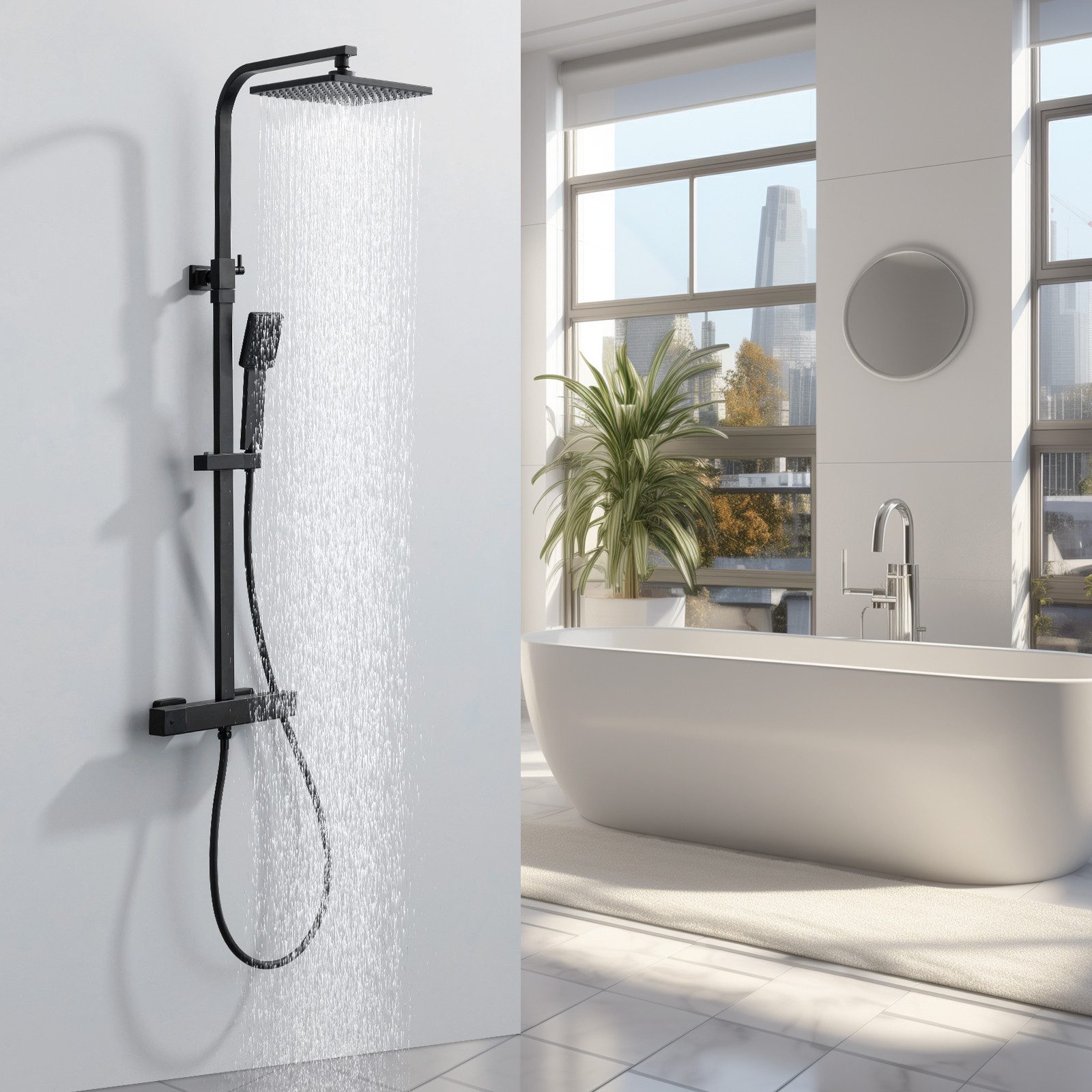 Genießen Sie ein modernes Duscherlebnis mit unserem eckigen Thermostat-Duschsystem in edlem Mattschwarz. Die hochwertige Verarbeitung aus Edelstahl, ABS-Kunststoff und die durchdachte Technik bieten Ihnen maximalen Komfort – ganz ohne erneutes Bohren.