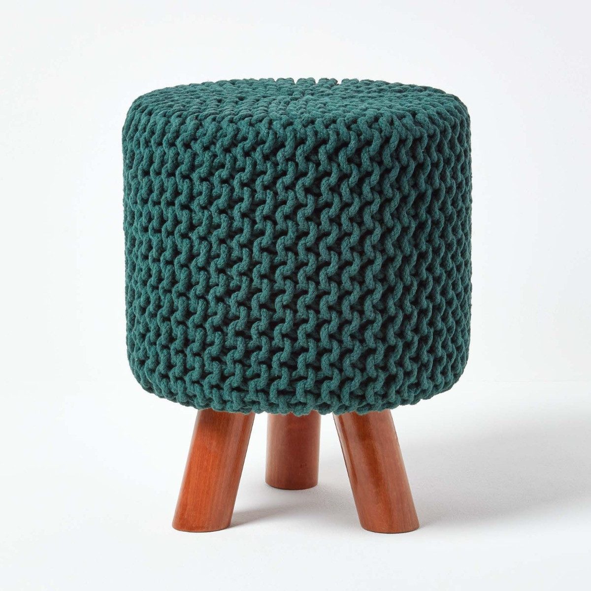 Dunkelgrüner Schemel mit grob gestricktem Bezug aus 100% Baumwolle und robustem Massivholzrahmen. Ideal als Fußstütze oder kleinen Beistelltisch.