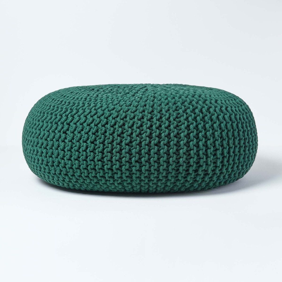 Dunkelgrüner Sitzpouf mit Bezug in Grobstrick-Optik und Polyester Füllung. Ideal als Fußauflage, kleinen Ablagetisch oder zusätzliche Sitzgelegenheit.