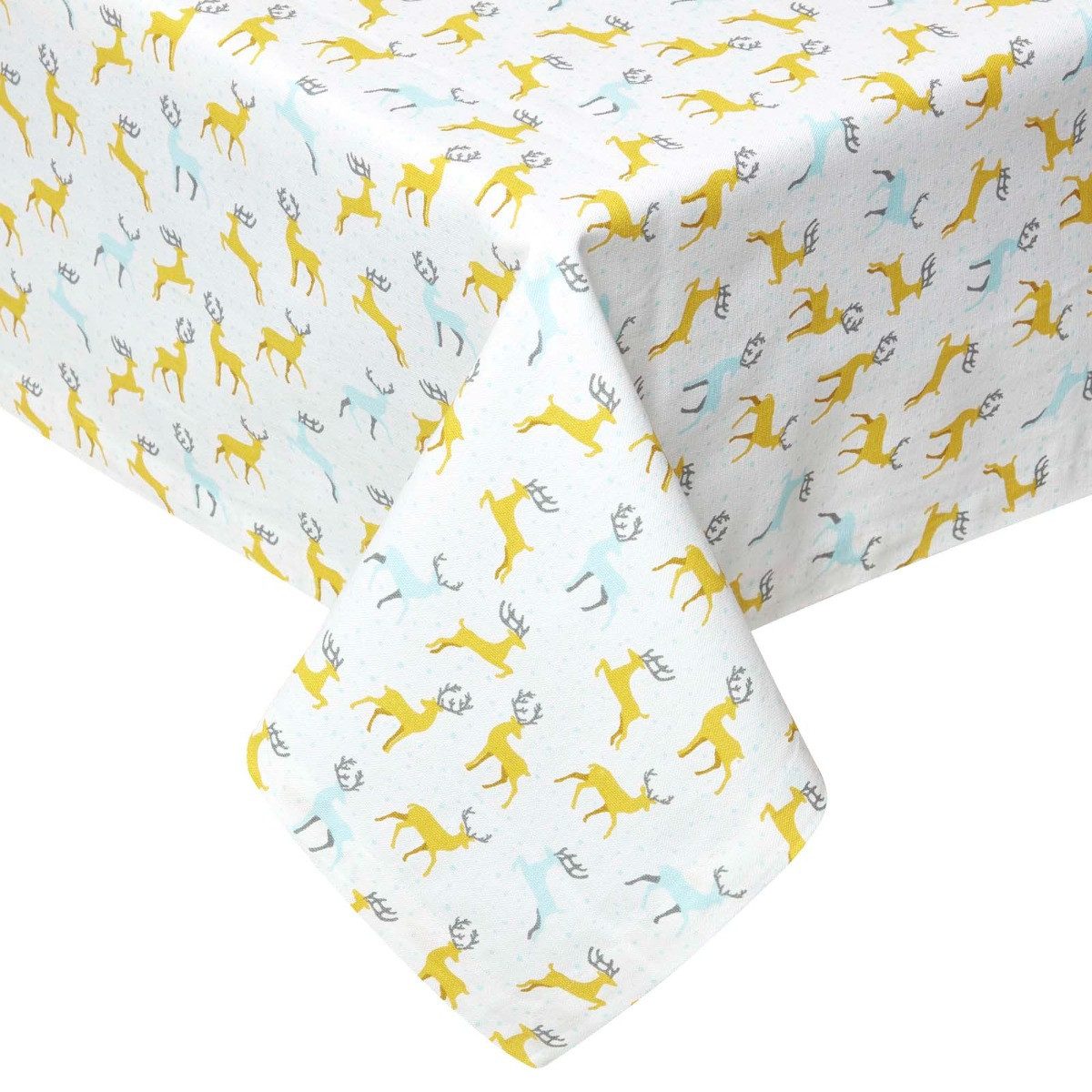 Moderne gelb-graue Weihnachtstischdecke mit Hirschmotiv. Diese Tischdecke aus Baumwolle im zeitgenössischen Stil ist Teil der exklusiven Kollektion Majestätischer Hirsch von Homescapes.