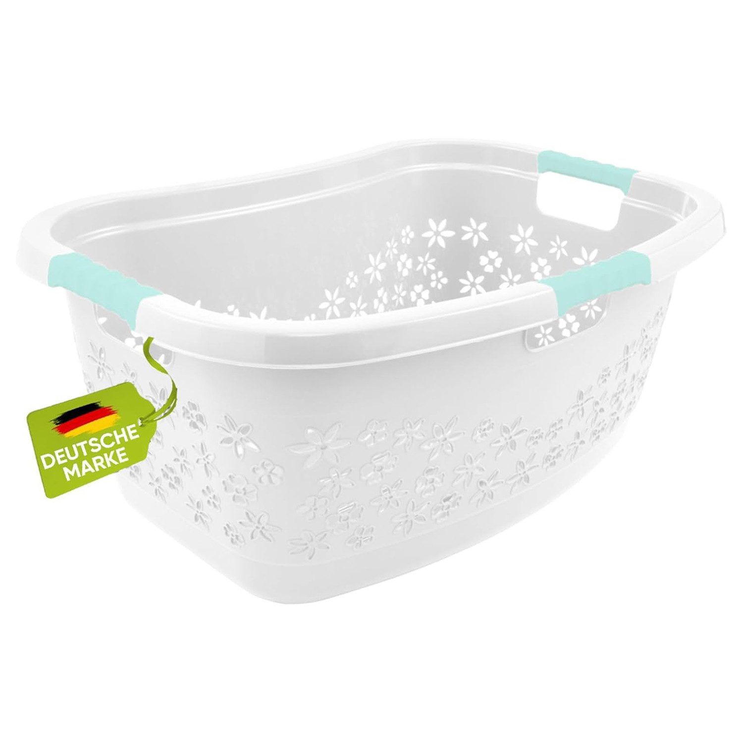 Durch die speziellen Soft-Touch-Griffe und die originelle Nierenform lässt sich der Korb ohne Kraftaufwand bequem vor dem Bauch oder der Hüfte tragen.