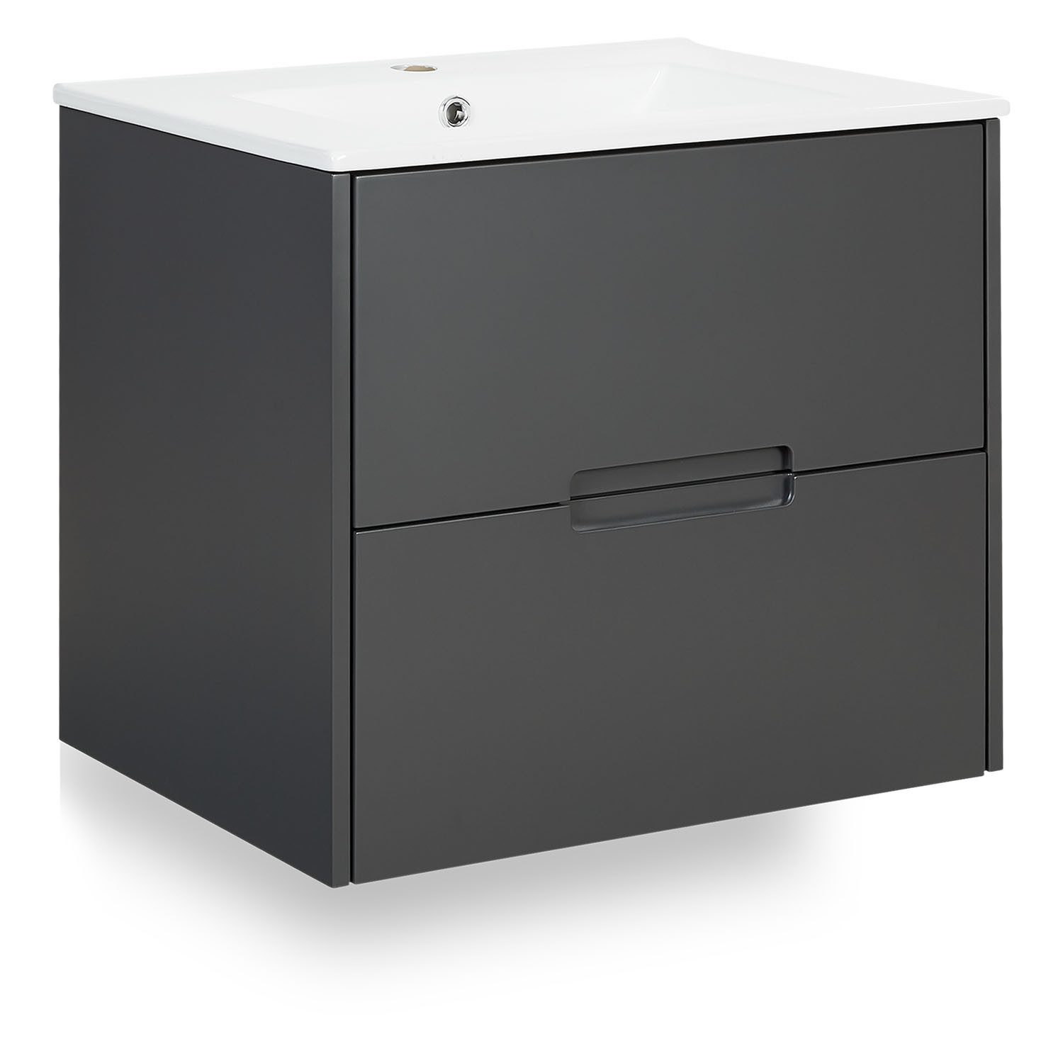 Materialzusammensetzung | Badezimmerschrank aus massivem MDF, grau foliert zur Wandbefestigung pflegeleichte Melaminbeschichtung großes Keramik Waschbecken, glänzend weiß |