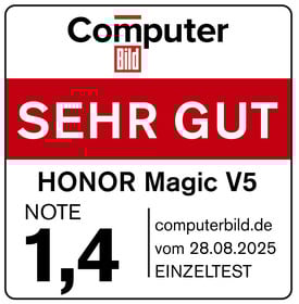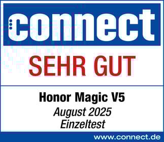 Das Honor Magic V5 erzielt im Einzeltest des Magazins „connect.de“ das Gesamtergebnis „sehr gut (427 Punkte)“ (von max. 500). Das Gerät ist „dünn und leicht“ und hat einen Staubschutz nach IP59. Es ist „sehr hochwertig“ verarbeitet. Das „überragende“ Display bietet eine Bildqualität „auf Top-Phone-Niveau“. Die Kamera ist „umfangreich“ ausgestattet und nimmt „sehr gute“ Bilder auf. Außerdem beträgt die „gute“ Akkulaufzeit beträgt „11:39 Stunden“. Insgesamt ist das Modell „ein Foldable ohne Kompromisse“.