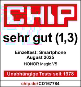 Das Honor Magic V5 erzielt im Einzeltest des Magazins „chip.de“ das Gesamtergebnis „Sehr gut (1,3)“. Die „sehr guten“ Displays bieten eine hervorragende Darstellungsqualität. Auch die „sehr gute“ Leistung überzeugt. Die „sehr gute“ Kamera nimmt sehr starke Bilder und Videos auf. Die „gute“ Akkulaufzeit beträgt „11:55 Stunden“ im Dauerbetrieb. Außerdem ist das Gehäuse „dünn“, „gut faltbar“ und nach IP59 geschützt. Insgesamt ist das Modell ein „modernes Falt-Smartphone“.