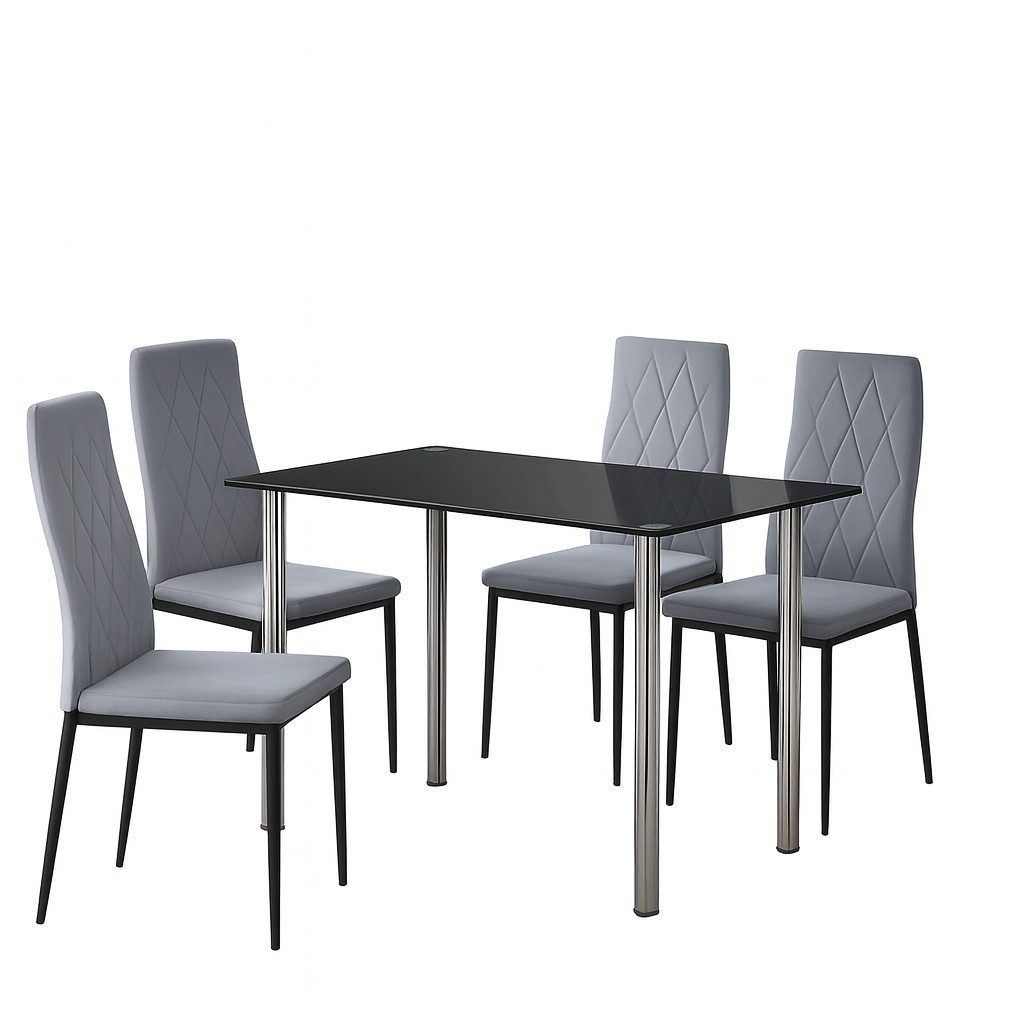 Zum Set gehören vier ergonomisch geformte Stühle mit stabilem Stahlgestell. Die Sitzflächen sind weich gepolstert und mit einem strapazierfähigen Stoffbezug aus 100 Prozent Polyester bezogen. Die hohe Rückenlehne bietet zusätzlichen Komfort beim Sitzen. Die Stühle sind in den Farben Grau oder Schwarz erhältlich und bis zu 110 Kilogramm belastbar.