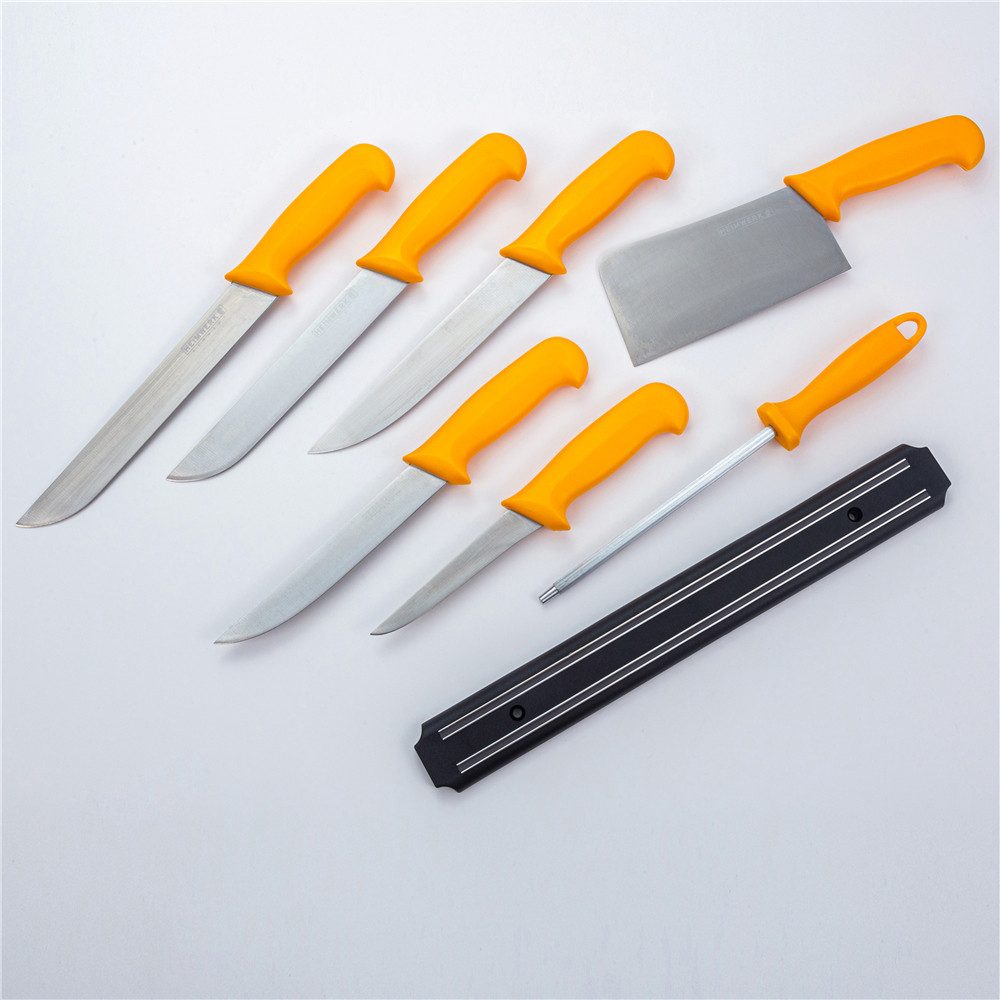Lieferumfang | 2x Fleischermesser (23/21 cm), 2x Stechmesser (20/18 cm), 1x Hackbeil, 1x Ausbeinmesser (13 cm), 1x Wetzstahl, 1x Magnetstreifen (38 cm) |