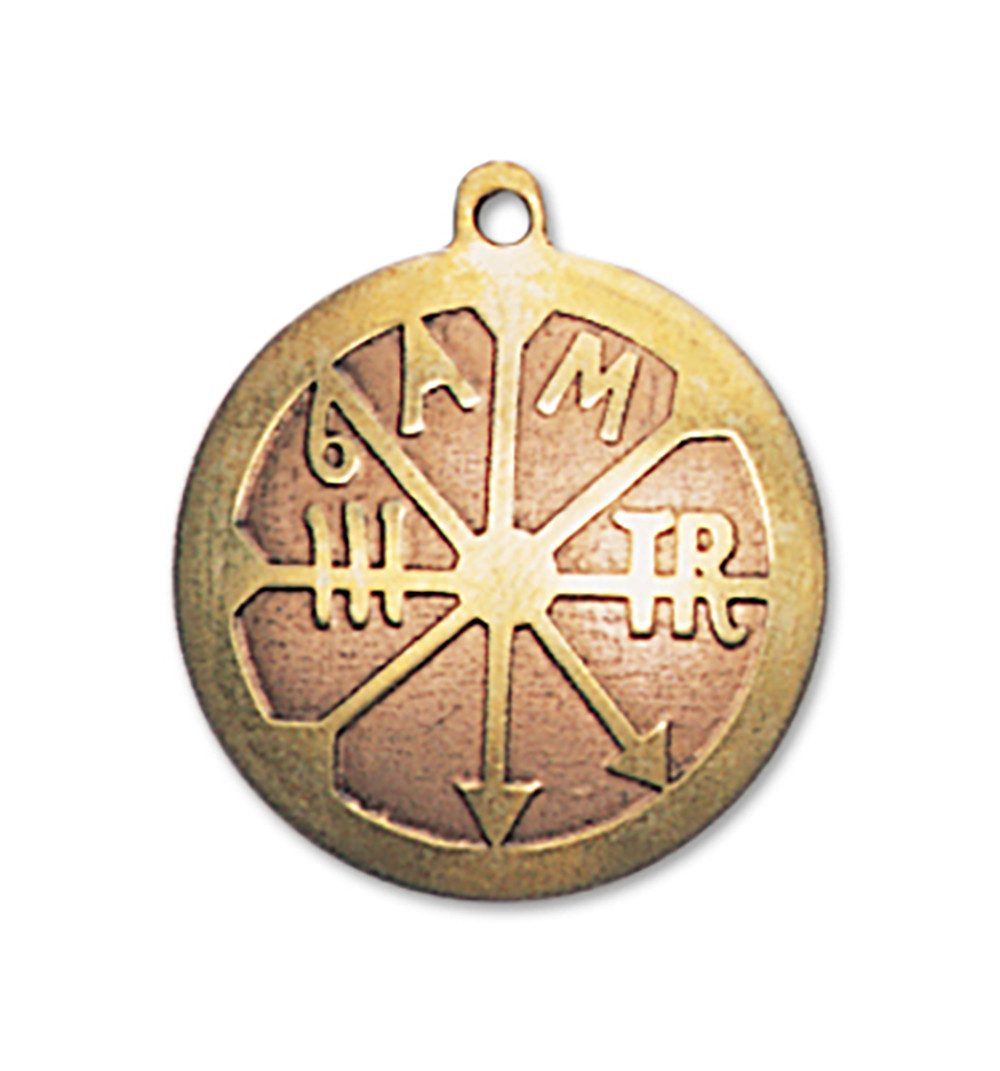 Die acht Speichen unterteilen das Amulett.Dies soll die unendliche Macht Gottes symbolisieren. Der Querbalken, welche für die menschliche Auffassungsgabe steht, wird links von drei senkrechten Strichen gekreuzt. Die Zahl Drei ist das Sinnbild für die Dreifaltigkeit, die in der äußeren materiellen und in der inneren spirituellen Welt wirkt. Das Schriftzeichen TR steht für das Wort Trisagion (=dreifach heilig) Die Buchstaben A und M bedeuten Anno Mundi, was soviel wie 'seit Anbeginn der Welt' bedeutet. Dies alles steht dafür, dass Gott in seiner dreifachen Gestalt von Vater, Sohn und heiligem Geist seit seiner Geburt über den Träger wacht.