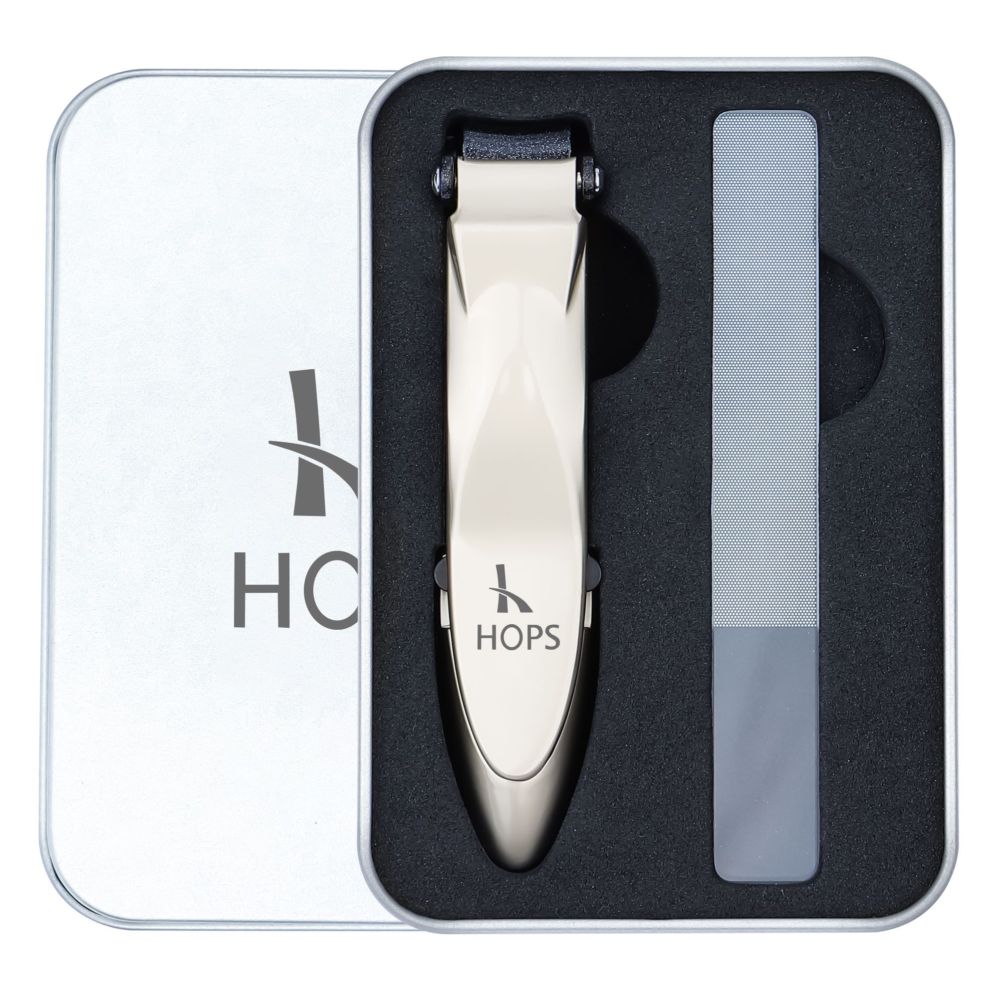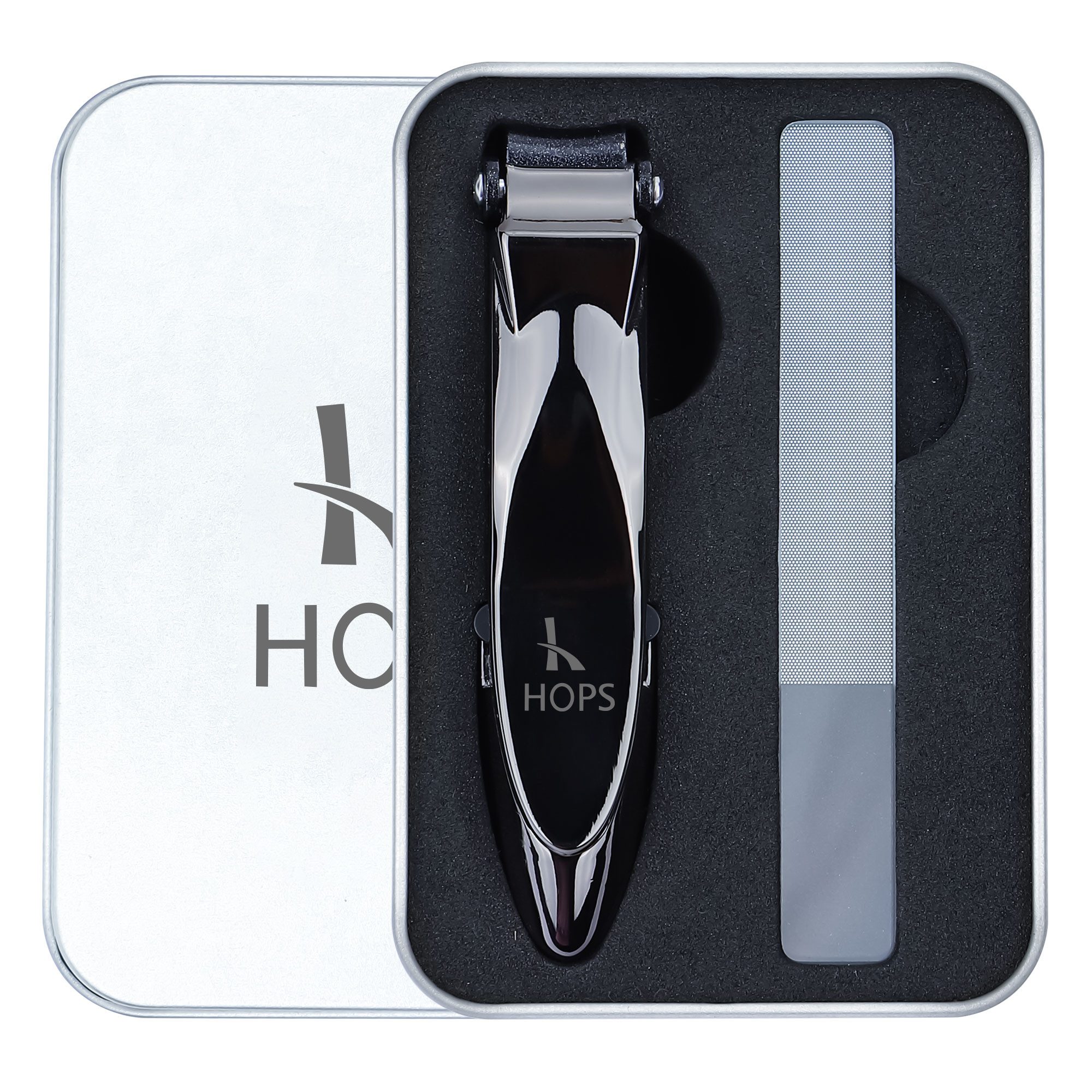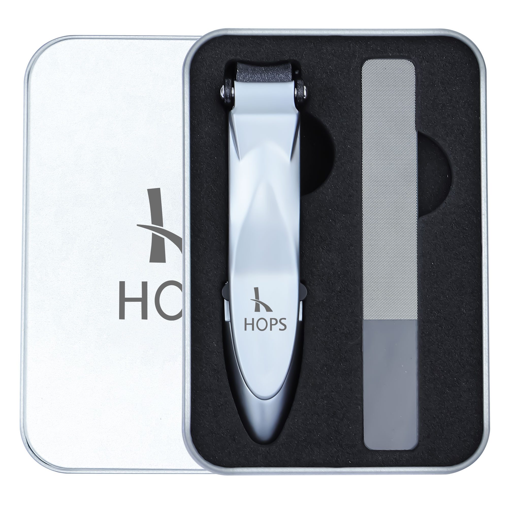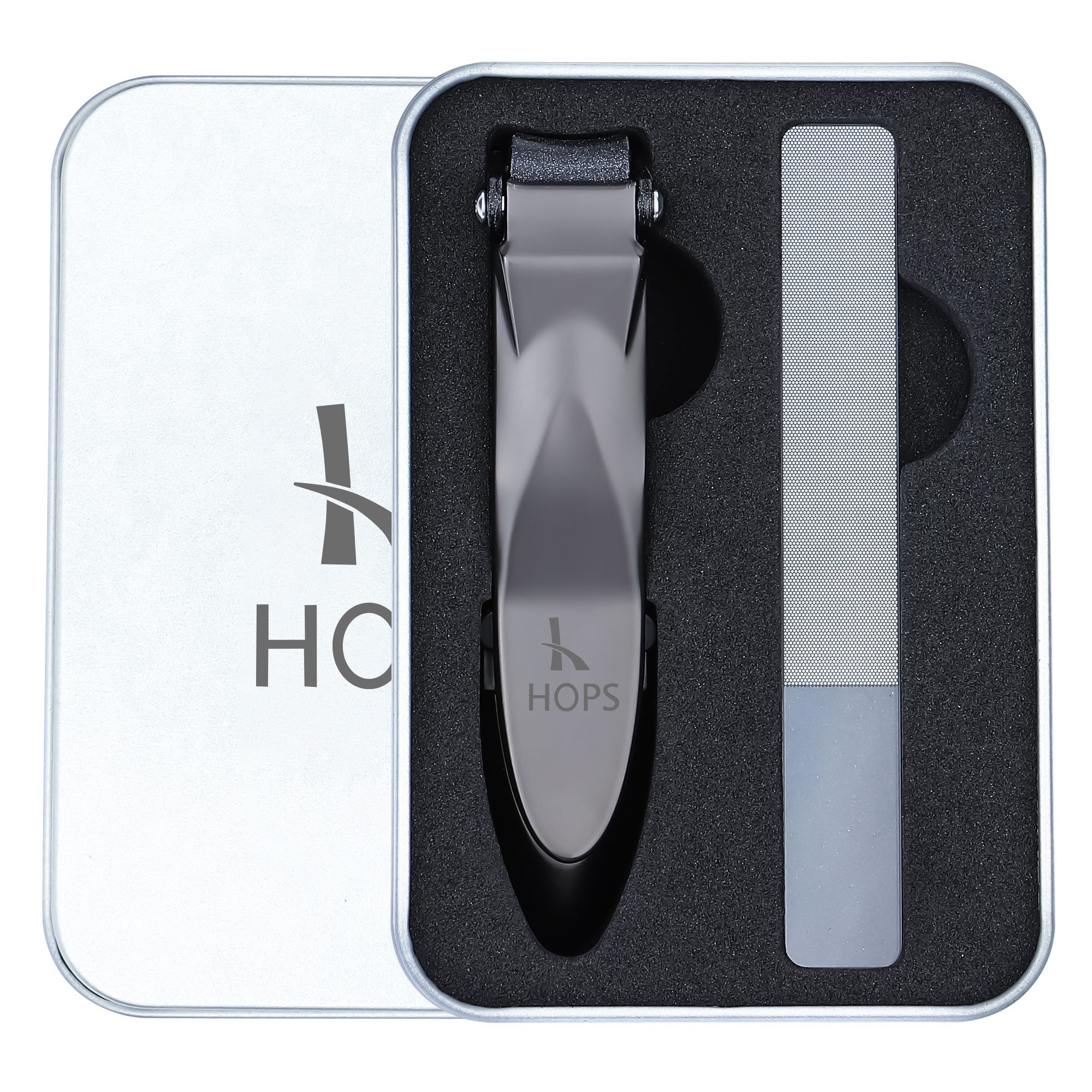 NAGELKNIPSER MIT FEILE UND AUFFANGBEHÄLTER IN GESCHENKBOX: HOPS Nagelknipser Set ist ein ideales Geschenk für Männer, Frauen oder Freunde.