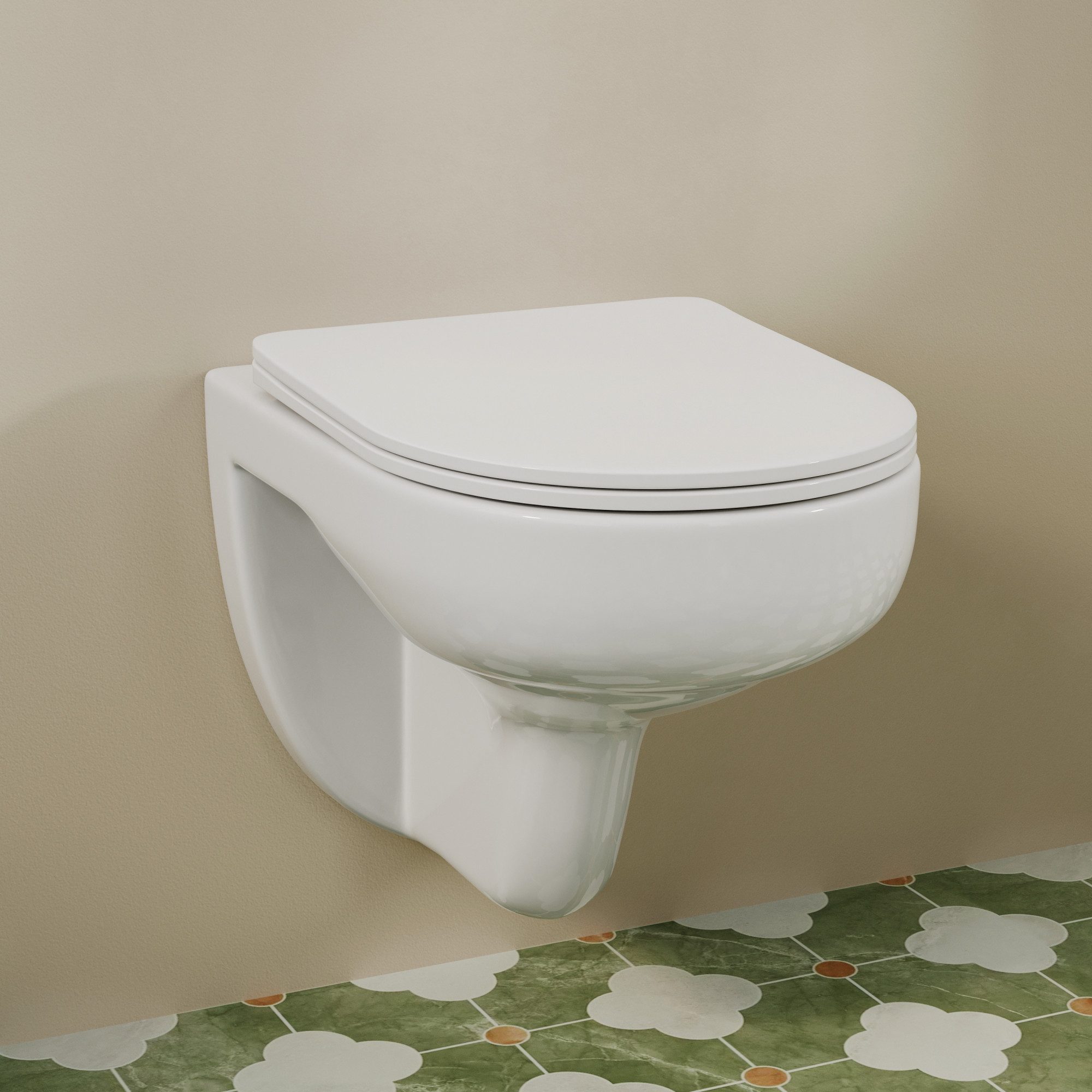 Der WC-Sitz verfügt über eine eingebaute Softclose-Funktion - ein leichtes Antippen genügt, um den Deckel sanft zu senken. Die kurze Ausführung macht dieses WC besonders geeignet für kleine Badezimmer.