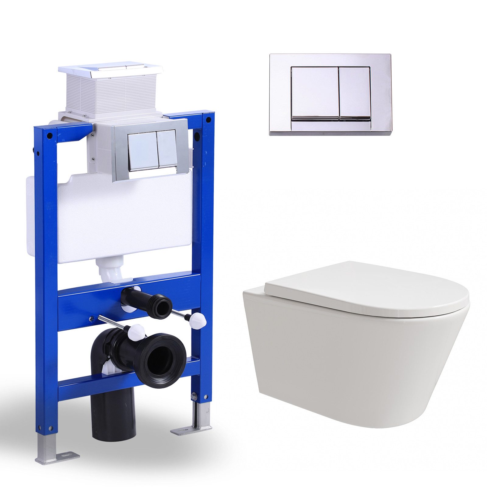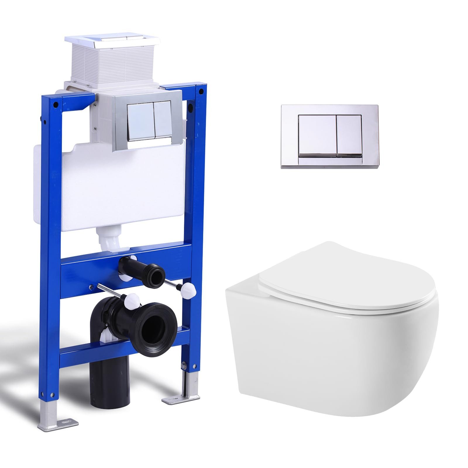 Es beinhaltet ein Hänge WC von HOROW sowie einen WC Spülkasten, eine Betätigungsplatte und Bausatz von HOROW.