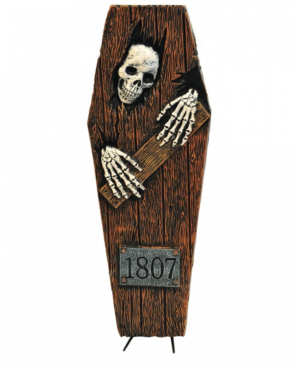 Kreiere mit unserem Gerippe im Sarg eine einzigartige Friedhofsszenerie. Das langlebige Material ist wetterfest. Die Figur selbst ist ca. 69 cm groß und mit realistischen Details versehen.