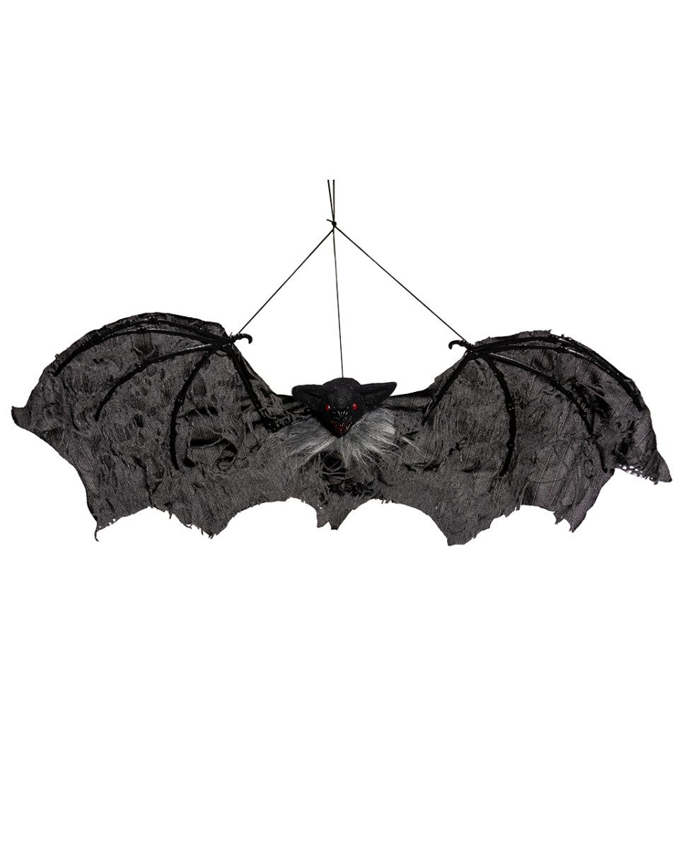 Die schwarze Deko-Fledermaus mit roten Augen und Fetzenflügeln kann aufgehängt werden. Sie ist 60 cm groß und mit realistischen Details, wie Kunstfellbesatz und spitzen Reißzähnen designt.