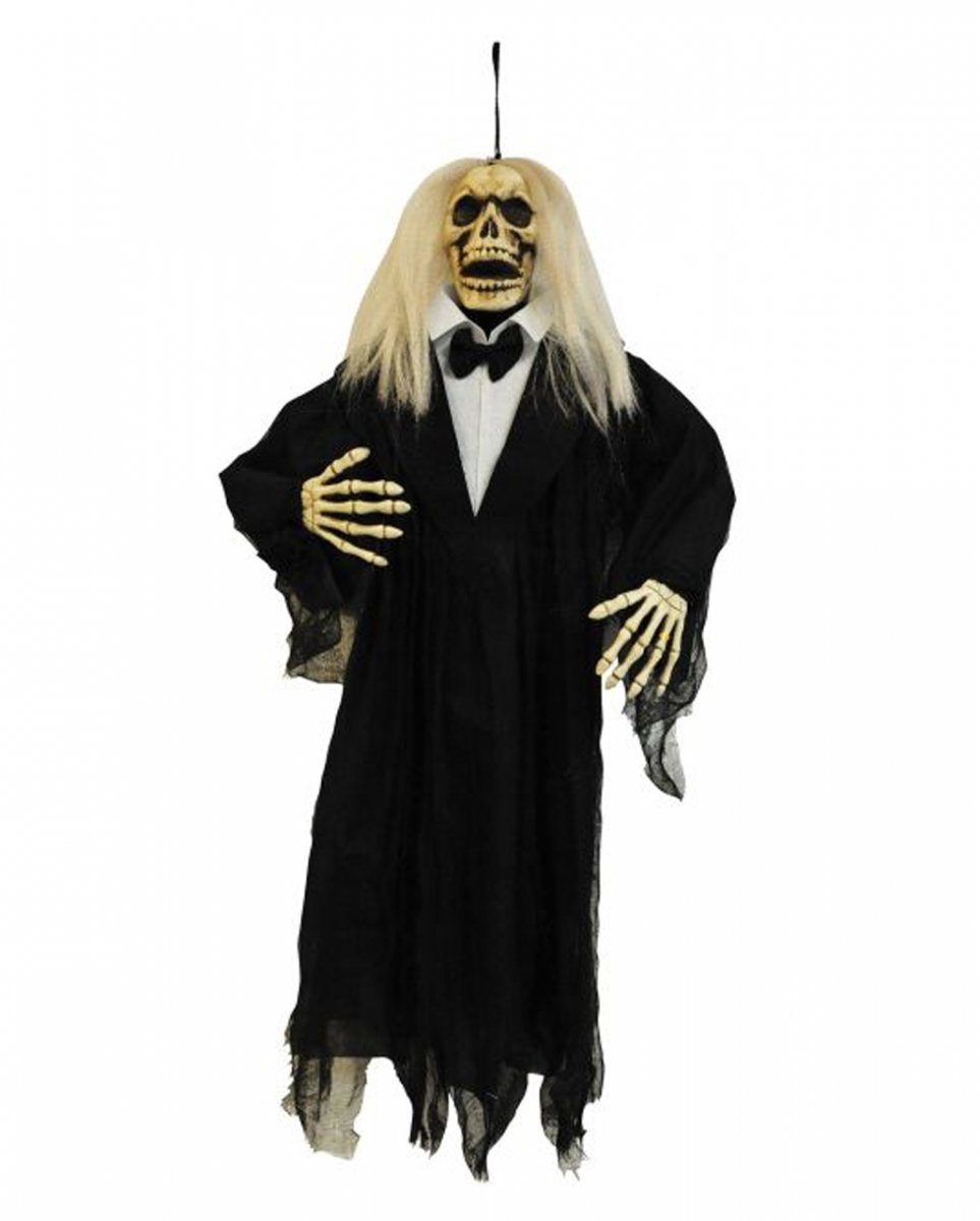 Die Skelett Zombie Bräutigam Hängefigur ist eine gruselige Halloween Deko Figur mit romantischer Note. Das liebestolle Skelett im schwarzen Frack ist aus Kunststoff und besitzt eine Höhe von etwa 80 Zentimetern.
