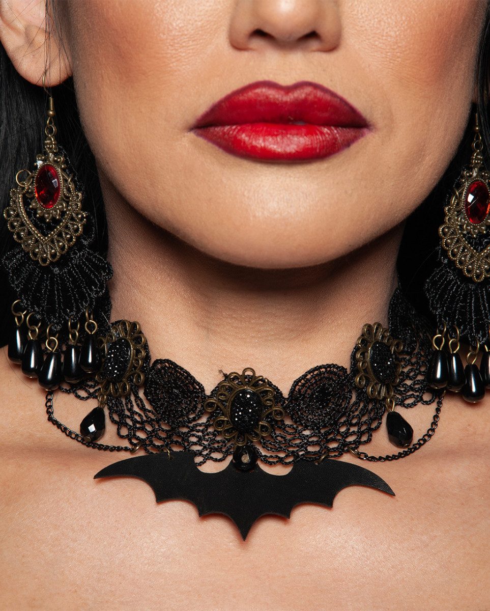 Die viktorianische Gothic Fledermaus Halskette begeistert mit einer filigranen Spitze und dem mystischen Fledermaus-Anhänger. Der Kostümschmuck ist für Vampire und schwarze Feen geeignet.