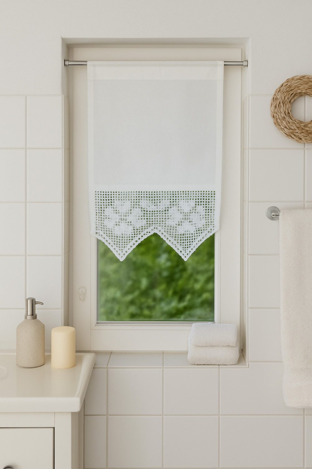 Diese Gardine verleiht jedem Raum einen Hauch von Romantik und nostalgischem Charme. Der halbtransparente Stoff sorgt für ein angenehmes, sanftes Lichtspiel und bewahrt gleichzeitig die gewünschte Privatsphäre. Besonders edel wirkt die handgehäkelte Spitze, die am unteren Abschluss romantische Akzente setzt und mit dem Stangendurchzug eine einfache Befestigung ermöglicht.