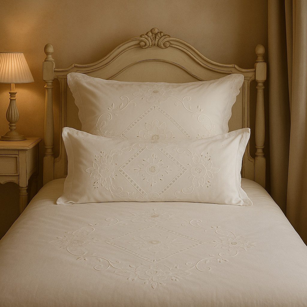 Ein echtes Schmuckstück für Ihr Schlafzimmer: Die romantische 3-teilige Bettwäsche von Hossner begeistert mit aufwendig gearbeiteter Richelieu Spitze in liebevoller Handarbeit. Der Shabby Landhaus Look in strahlendem Weiß verleiht Ihrem Bett eine elegante, nostalgische Note und macht es zum Blickfang.