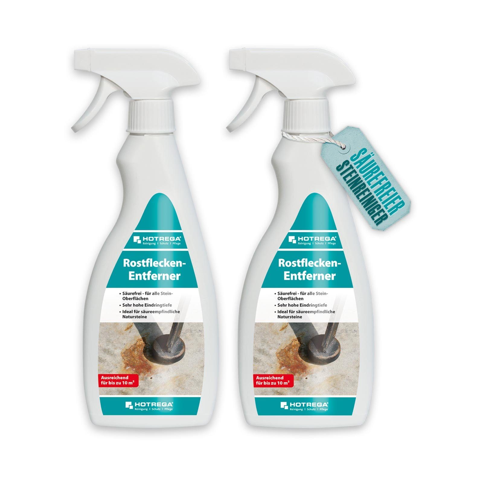 Entfernt schonend und zuverlässig selbst tief eingezogene Rostablagerungen, die z.B. durch eisenhaltige Dünger, Gartenmöbel und Werkzeuge aus Metall, Heizungsleckagen, tropfende Wasserhähne o.ä. entstanden sind.
