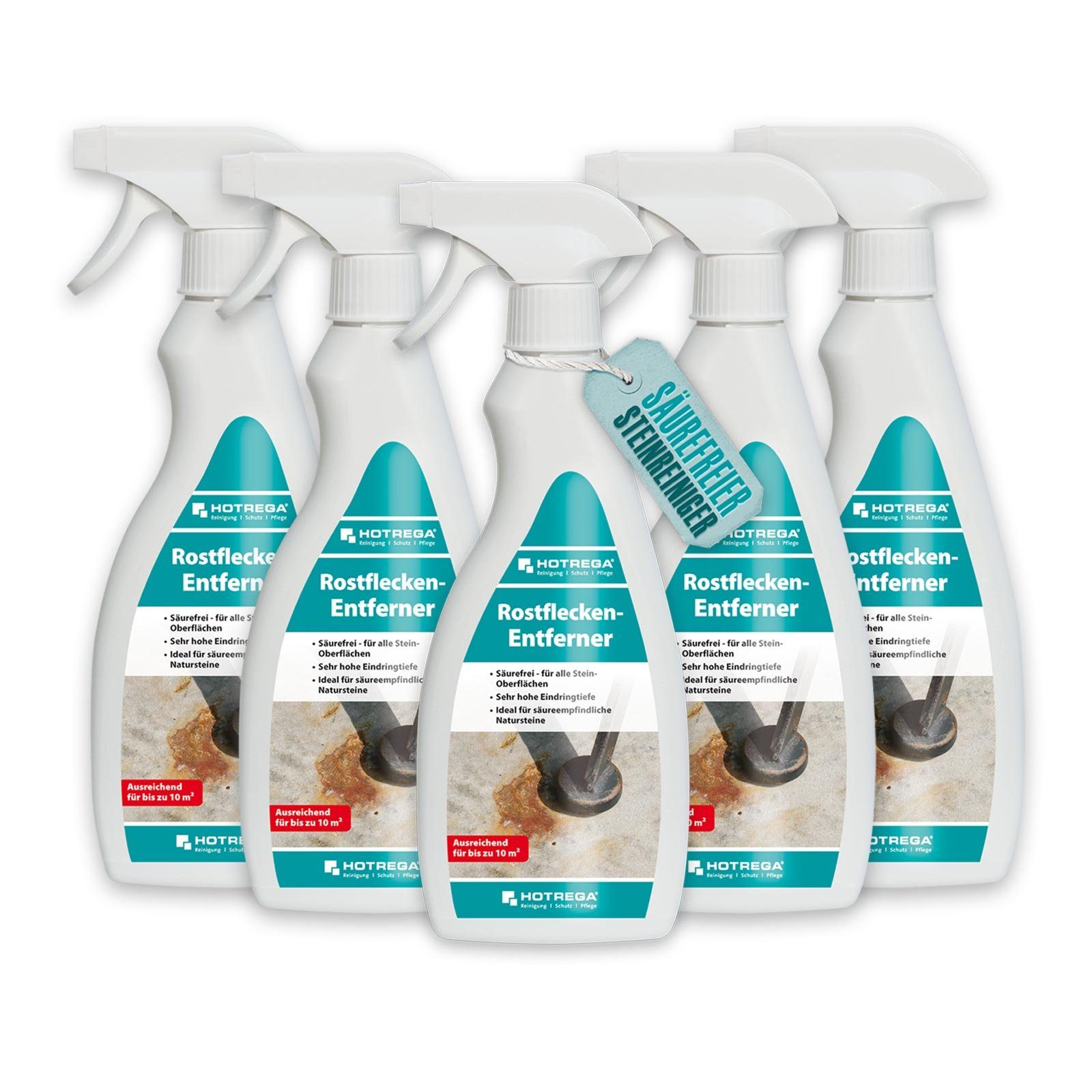 Entfernt schonend und zuverlässig selbst tief eingezogene Rostablagerungen, die z.B. durch eisenhaltige Dünger, Gartenmöbel und Werkzeuge aus Metall, Heizungsleckagen, tropfende Wasserhähne o.ä. entstanden sind.