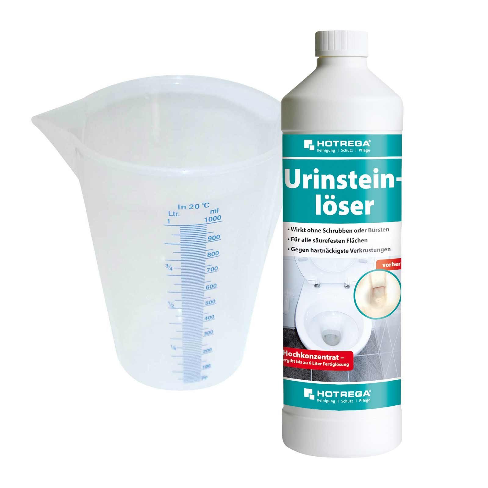 Urinsteinentferner zum selbsttätigen Lösen von hartnäckigsten Urinsteinverkrustungen, Seifenstein, Kalkablagerungen und Rostflecken im Sanitärbereich. Für alle säurefesten Flächen geeignet. Inklusive Messbecher 1 Liter.