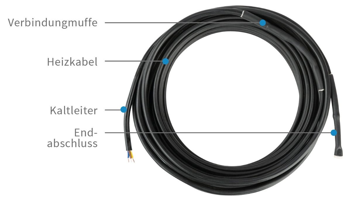 Die Heizkreise bestehen aus einem Festwiderstandsheizkabel mit einem UV-beständigen Polyolefin-Außenmantel und sind mit einem Kaltleiter (5m Длина), einer Verbindungsmuffe und einem Endabschluss versehen. Die Ummantelung mit Aluminiumband mit 100 %iger Bedeckung im Inneren des Kabels bietet zusätzliche mechanische Festigkeit und dient zusammen mit einem