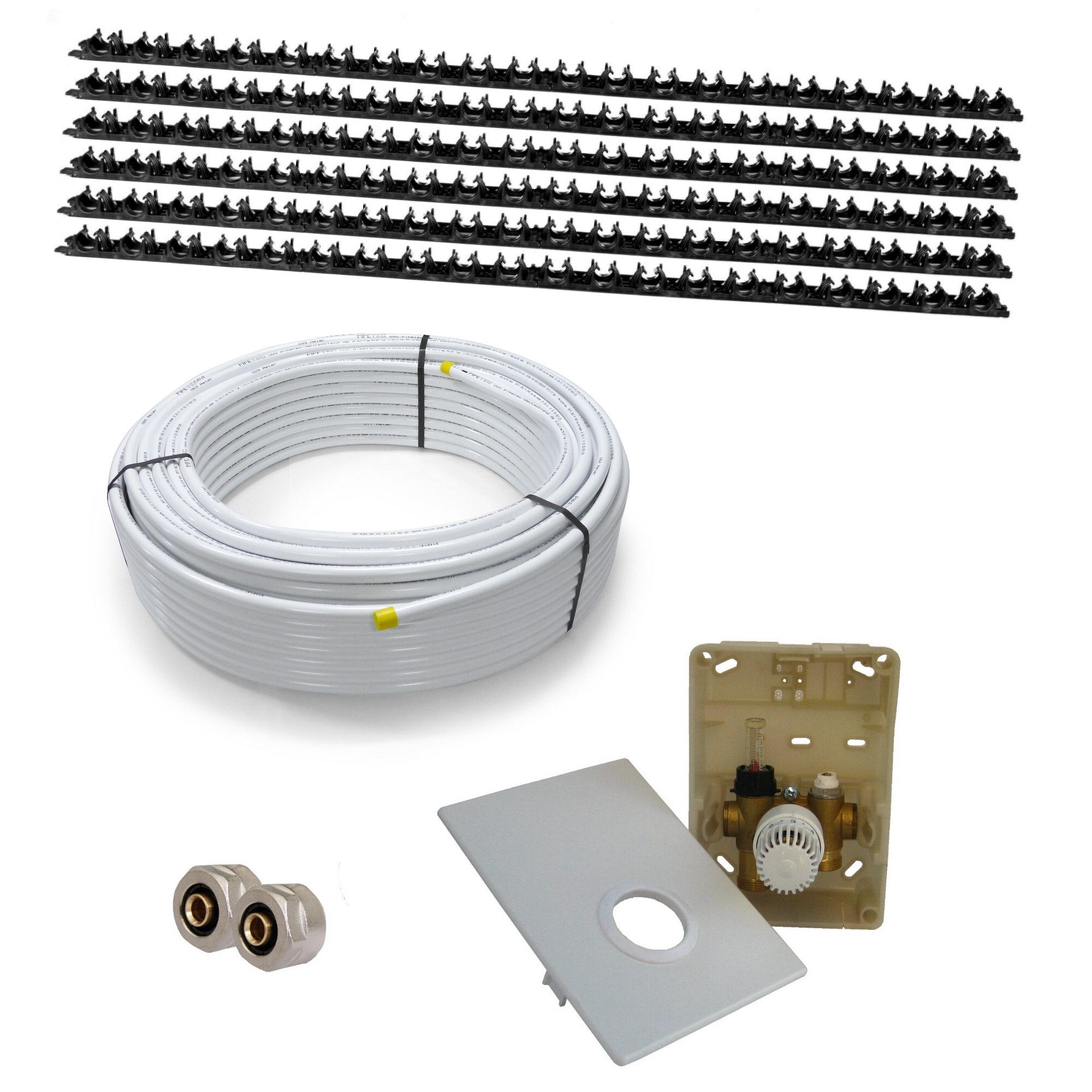 Das enthaltene Mehrschichtverbund-Heizrohr (ø 16 x 2 mm) erhält durch die Rohr-Halteclipse einen festen Sitz auf der Schiene - ein Herausspringen des Rohres ist nicht möglich.