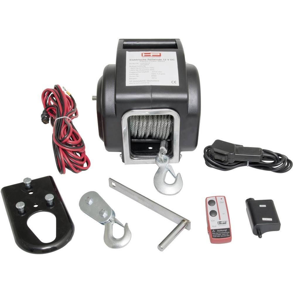 Eigenschaften | Ausführung (allgemein): Funk · Befestigungsart (im Auto): Festmontage, Einhängen an die Anhängerkupplung · Betriebsspannung: 12 V · Gewicht: 22.5 kg · Produktabmessung, Breite: 28 cm · Produktabmessung, Höhe: 23.5 cm · Produktabmessung, Tiefe: 27 cm · Seil-Длина: 12 m · Seil-Ø: 7.2 mm · Seilwinden-Besonderheiten: Kabel-Fernbedienung, Funk-Fernbedienung · Zugkraft (rollend): 6800 kg |
